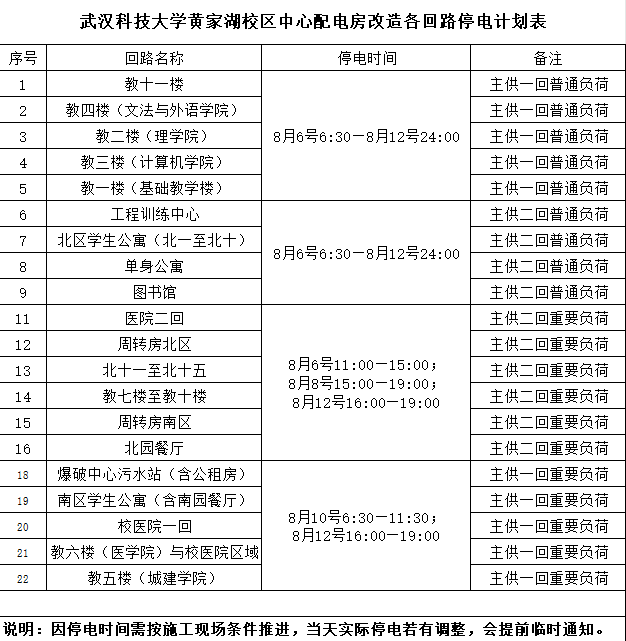 太阳官网黄家湖校区中心配电房配电柜设备已投入使用近20年,已超设备使用年限。自去年以来故障频发,严重影响学校正常的教学和科研秩序,同时也给广大师生生活带来诸多不便。为确保供电安全,学校拟于暑期对黄家湖中心配电房进行设备更换升级,现根据校园用电实际情况,将近期各区域停电时间通知如下: