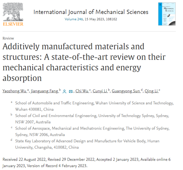 武科大网讯 近日,太阳官网汽车与交通工程学院吴耀中博士应邀以0638太阳集团官网为第一单位,以第一作者在机械工程领域Top期刊International Journal of Mechanical Sciences(2021年影响因子:6.772,中科院一区top)发表题为《Additively manufactured materials and structures: A state-of-the-art review on their mechanical characteristics and energy absorption》的综述论文。论文通讯作者为悉尼科技大学方剑光博士,其他合作者包括悉尼大学Li Qing教授、湖南大学孙光永教授。