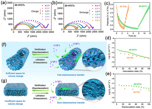 团队通过静电自组装结合热处理去除模板的方法构建了三维Ti3C2Tx MXene中空管,不仅解决了二维MXene纳米片的堆叠团聚问题,而且还消除了–F和–OH官能团对电化学性能的不利影响。得益于微观结构设计和表面官能团有效调控的协同作用,该材料用于锂离子/钾离子电池的负极材料时,均表现出较高的表面电容贡献和快速的离子扩散动力学;在0.1 A g−1的电流密度下,经过300次和200次循环后,钾离子电池和锂离子电池的容量分别高达199.2和586.0 mAh g−1;此外,该材料的倍率性能和循环性能优于目前已报道的大部分MXene基负极材料。论文以“Structure and surface modification of MXene for efficient Li/K-ion storage”为题发表在Journal of Energy Chemistry上(2021年影响因子13.6,DOI: 10.1016/j.jechem.2022.08.023),论文第一作者为省部共建耐火材料与冶金国家重点实验室2019级博士研究生管可可,通讯作者为雷文副教授和张海军教授。