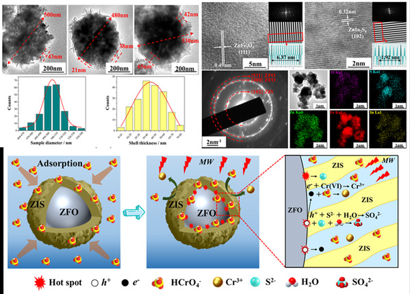 ZnFe2O4(ZFO)具有饱和磁化强度高、微波吸收能力强和微波响应频带宽等优点,被应用于微波诱导催化过程,但其在微波催化还原水中Cr(VI)离子时存在着催化能力有限、反应速度慢且只适用于酸性环境等缺点。基于此,团队采用两步水热法将具有高比表面积和高化学稳定性的ZnIn2S4(ZIS)与ZFO复合,制备了具有核/壳结构的ZFO@ZIS复合催化剂,并用其微波催化还原水中的Cr(VI)离子。团队成员通过一系列实验,揭示了ZFO@ZIS微波催化还原Cr(VI)离子的理论机制,在pH=6的近中性环境中于15 min内实现了浓度高达100 mg/L的Cr(VI)离子溶液的完全还原,其催化效率远高于目前已报道的其它类型的催化剂,对Cr(VI)离子近中性条件下的快速高效处理具有重要意义。研究论文“Preparation of core/shell-structured ZnFe2O4@ZnIn2S4 catalysts and its ultrafast microwave catalytic reduction performance for aqueous Cr(VI)”在线发表于Chemical Engineering Journal上(2021年影响因子16.744,DOI: 10.1016/j.cej.2022.138182)。论文第一作者为省部共建耐火材料与冶金国家重点实验室2021级博士研究生张竞哲,通讯作者为李发亮副教授和张海军教授。