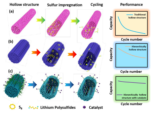 锂硫电池具有理论能量密度高和活性物质硫资源丰富的优点,是极具发展潜力的二次电池之一。然而,硫颗粒较低的导电率、充放电过程中的体积膨胀以及多硫化锂的穿梭效应等问题严重降低了活性物质的利用率、电池的循环稳定性以及倍率性能。针对上述问题,团队对硫载体进行结构设计,在追求高硫载量的同时,协同调控多硫化物的热力学和动力学扩散。