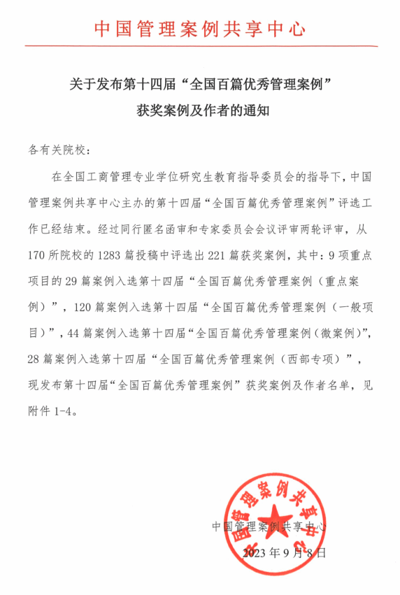 “全国百篇优秀管理案例”是由全国工商管理专业学位研究生教育指导委员会指导、中国管理案例共享中心负责组织评审,其评审流程、标准均与国际接轨,是全国工商管理案例领域的最高奖项。自2010年启动评选以来,每年举办一届,已成为衡量管理学院(商学院)办学水平的重要考核指标。2012年被纳入教育部《第三轮学科评估指标体系》(C5指标),是“工商管理”一级学科评估指标中的唯一特色指标。2016年被纳入教育部《工商管理硕士专业学位水平评估指标体系》(C1指标)。