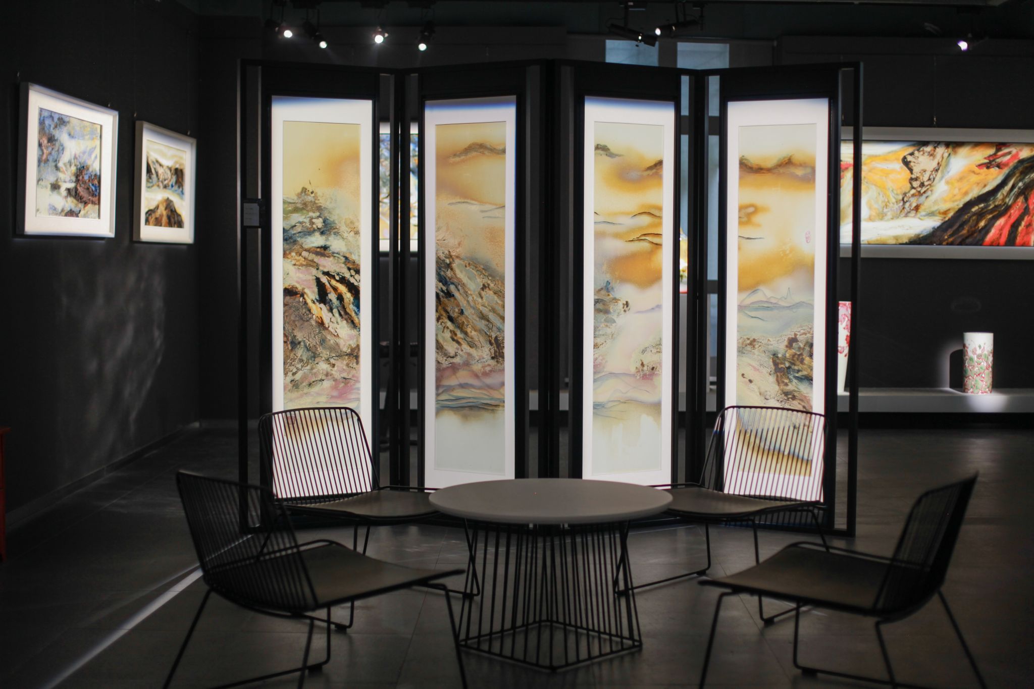 作品《日暮里》吸引了不少学生驻足观赏,管家庆将这件作品与屏风相结合,旨在让传统文化与现代美学碰撞。谈及创作理念,管家庆说道:“该系列充分体现出‘神山圣水’的生命体验——行走、攀登、下降、上升的轨迹,应和了中国成语‘高山流水’,那是纯粹中国式的审美体验与痕迹,亘古不变。”