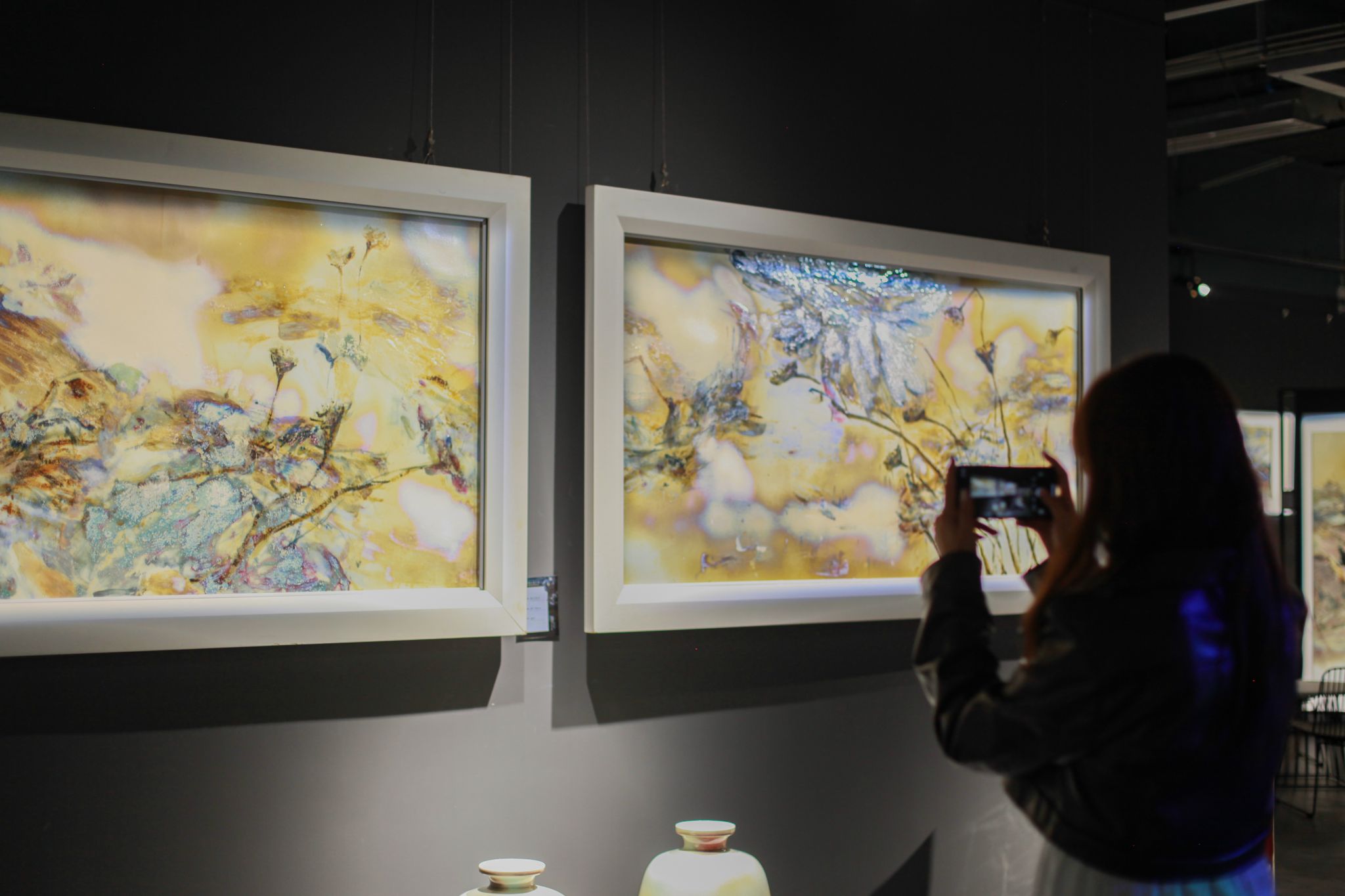 宁阳表示,传统陶瓷使用釉上彩,而管家庆使用釉下彩,即以高温颜色釉作为彩料在瓷器上进行绘制的独特陶瓷绘画种类。观展学生张虎琛说,将东方古老的工艺材料与现代艺术理念、西方艺术元素相结合,高温颜色釉瓷画让我们感受到艺术魅力,传统与现代的创新融合为我们带来了视觉盛宴。