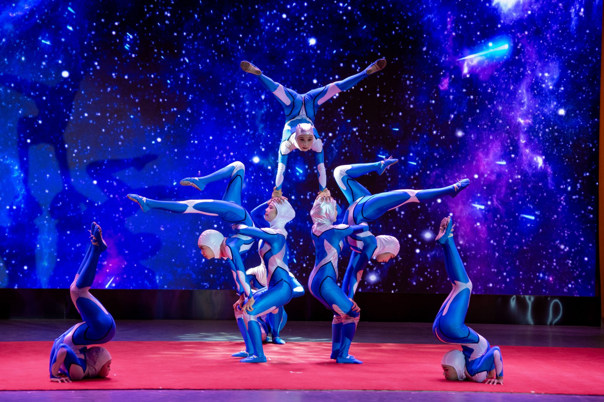《太空漫步—力量》《力与美—双人顶 》中,在震撼的背景音乐下,表演者在一根转动的杆上,运用手臂、腿部、腰部等力量做出高难度技巧动作,舞步轻盈游滑,宛如流动的雕塑,精湛的表演技术将演出推向高潮,引得观众连连惊呼:“杂技表演中高难度的动作和柔美至极的表演真的扣人心弦、精彩纷呈!”