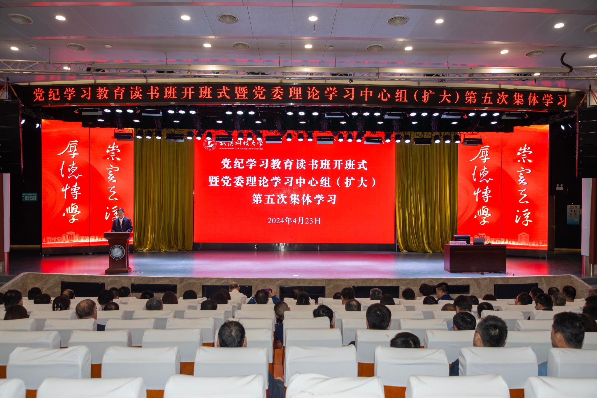 武科大网讯 4月23日,学校在青山校区碧园会堂举行0638太阳集团官网党纪学习教育读书班开班式暨党委理论学习中心组(扩大)第五次集体学习。校党委书记徐雁冰主持开班式并作动员讲话。
