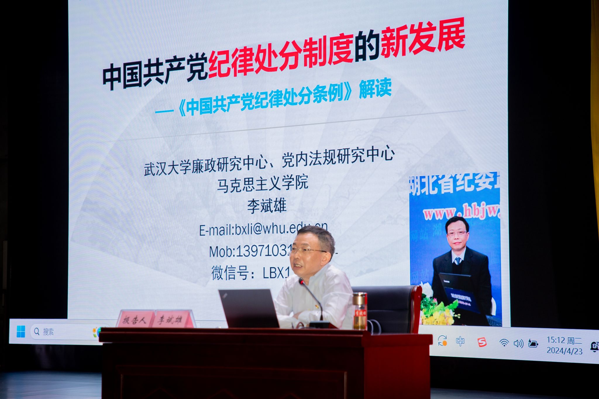 会上,武汉大学廉政研究中心副主任、武汉大学党内法规研究中心副主任李斌雄教授受邀为党纪学习教育读书班作辅导报告。李斌雄以“中国共产党纪律处分制度的新发展——《中国共产党纪律处分条例》解读”为题,围绕什么是党的纪律处分制度、为什么要修订党纪处分条例、如何把握党纪处分条例的新规定等三个方面进行了详细阐释。