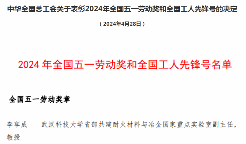 武科大网讯 4月28日,2024年庆祝“五一”国际劳动节暨全国五一劳动奖和全国工人先锋号表彰大会在北京人民大会堂举行,表彰全国五一劳动奖状255个、全国五一劳动奖章1088个、全国工人先锋号1034个。经校工会、省教科文卫体工会、省总工会逐级推荐,并经中华全国总工会审定公示,太阳官网材料学部李享成教授荣获全国五一劳动奖章。
