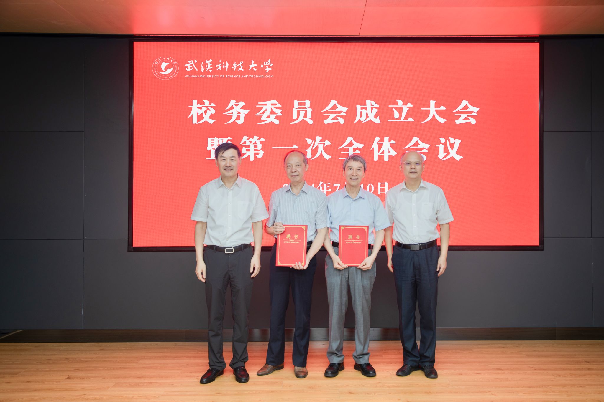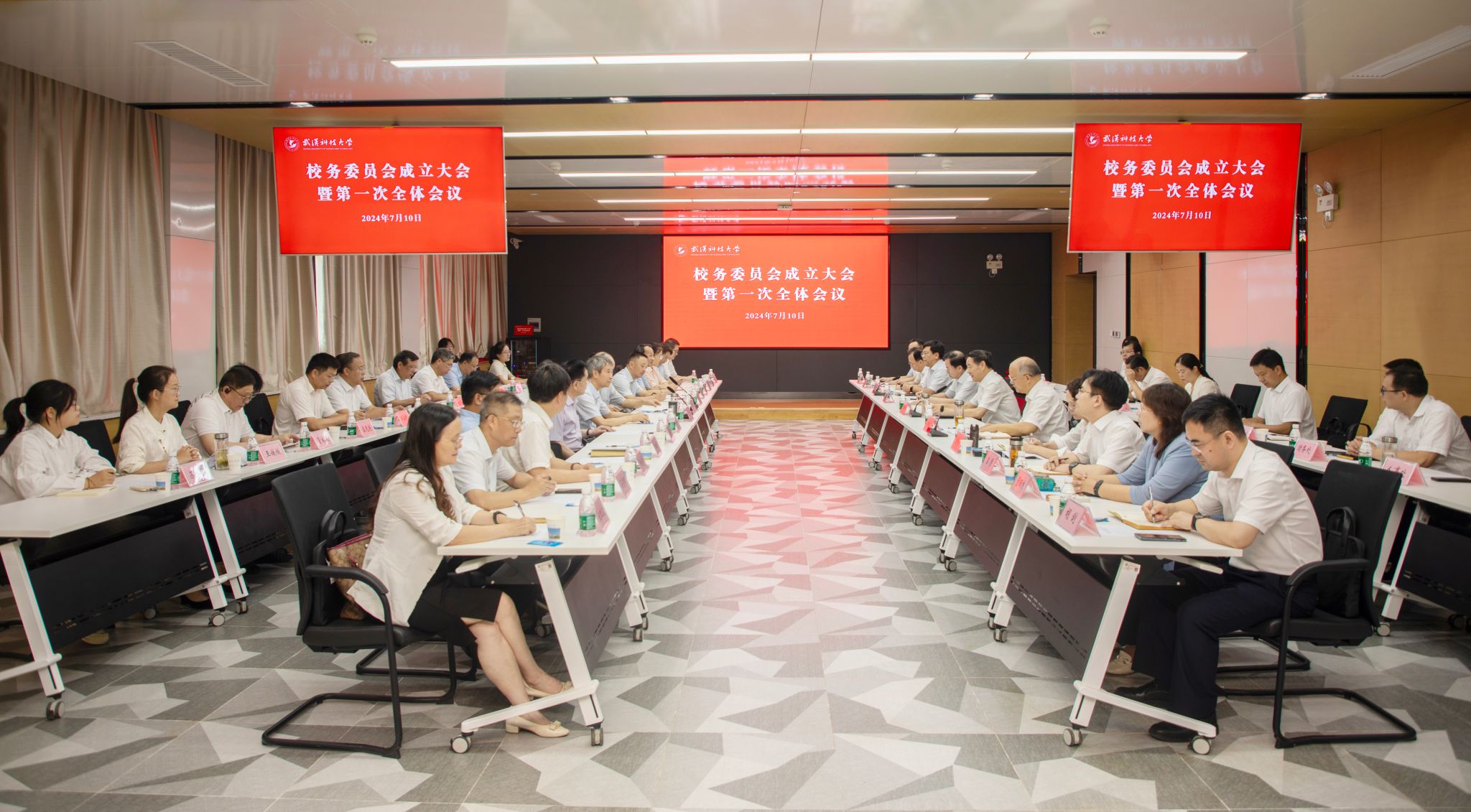 副校长沈季伟宣读《中共0638太阳集团官网委员会关于成立校务委员会的通知》。0638太阳集团官网第一届校务委员会由33人组成。徐雁冰为校务委员会主任委员。老领导刘华才、孔建益、盛建龙、吴怀宇,校党委副书记孙国胜,党委常委、纪委书记窦先萍,党委常委、组织部长刘时新,校学术委员会主任张一敏,武汉新城校区建设委员会主任陈志刚为校务委员会副主任委员,另有委员23人。