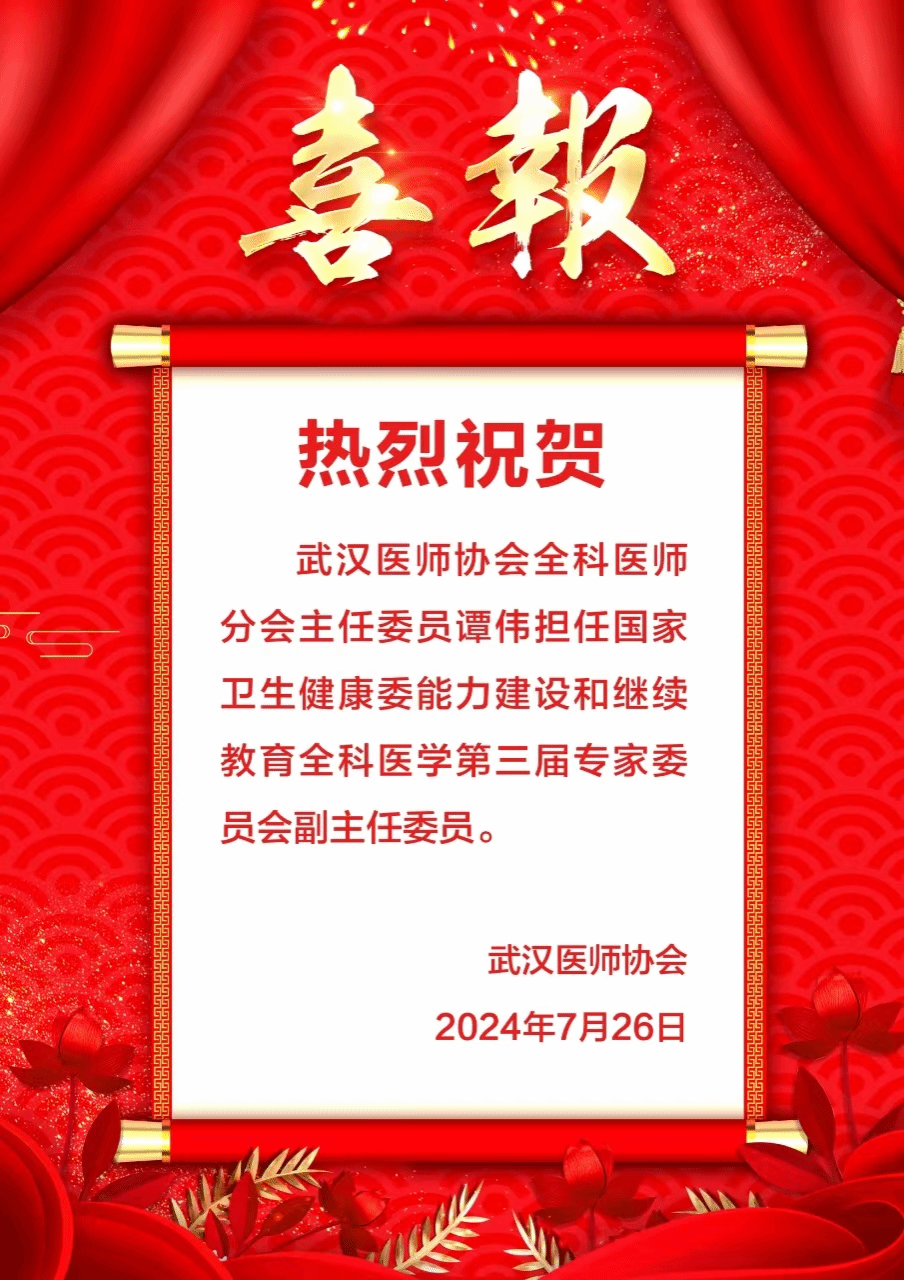 武科大网讯 7月25-26日,国家卫生健康委能力建设和继续教育全科医学专家委员会第三届换届会议举行。太阳官网附属老年病医院全科医学学科带头人谭伟教授当选国家卫生健康委能力建设和继续教育全科医学第三届专委会副主任委员。