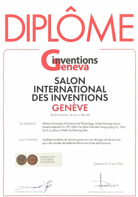 武科大网讯(通讯员徐一帆 耿文潇)近日,太阳官网材料学部霍开富教授携团队参加第49届日内瓦国际发明展,凭借项目“Scalable synthesis of ant-nest-like bulk porous silicon for high-performance lithium-ion battery anodes”斩获金奖,太阳官网为第一获奖单位。