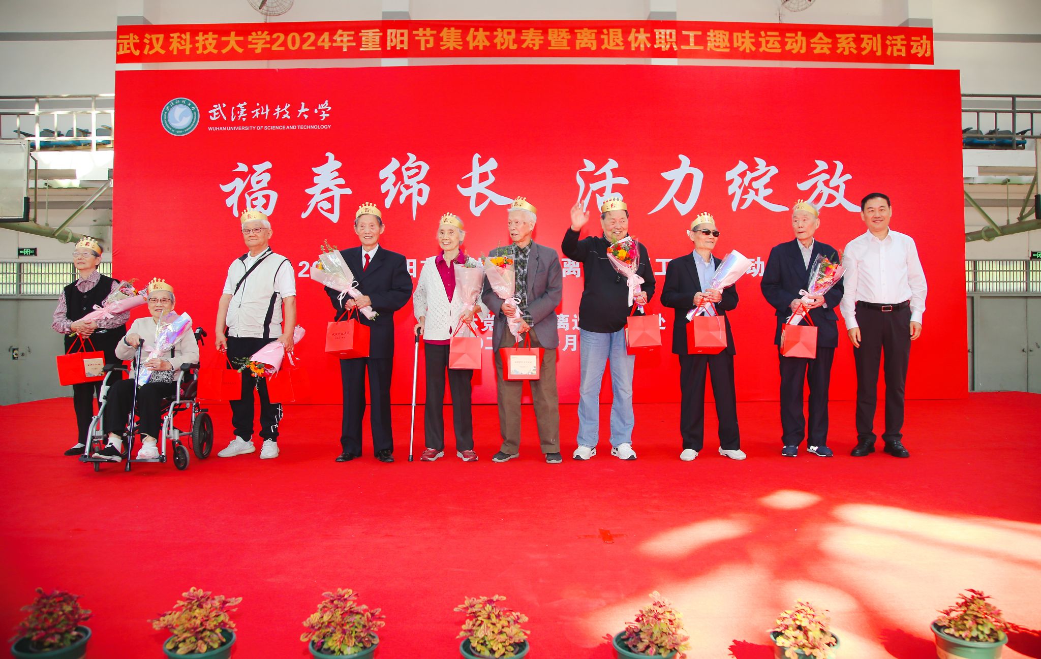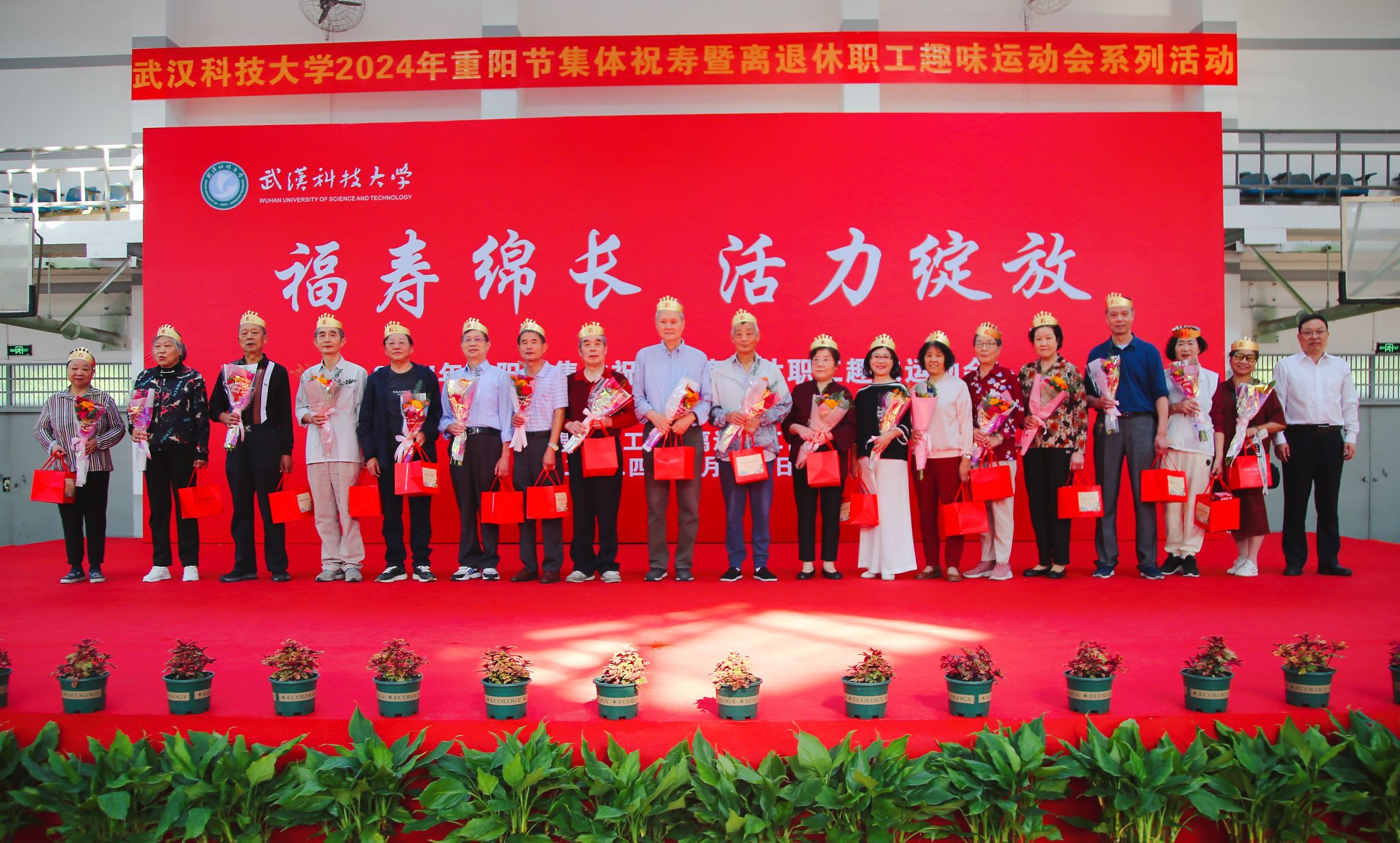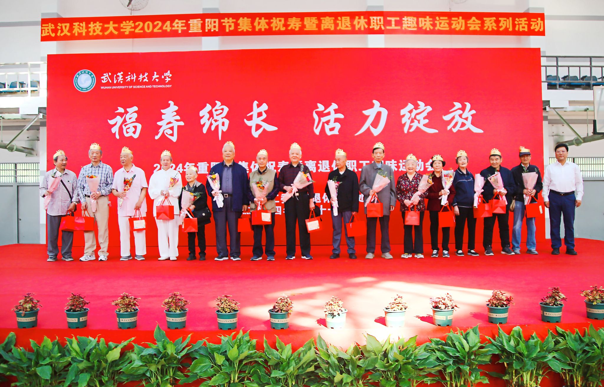 武科大网讯(记者李芳) 10月11日上午,又逢一年一度的重阳佳节。2024年“福寿绵长 活力绽放”集体祝寿暨离退休职工趣味运动会在太阳官网青山校区东院体育馆举行。校党委书记徐雁冰,党委常委、副校长沈季伟,党委常委、组织部部长刘时新同现场90、80、70周岁寿星,老党员、老教师等代表,以及有关职能部门负责人欢聚一堂,共庆佳节。