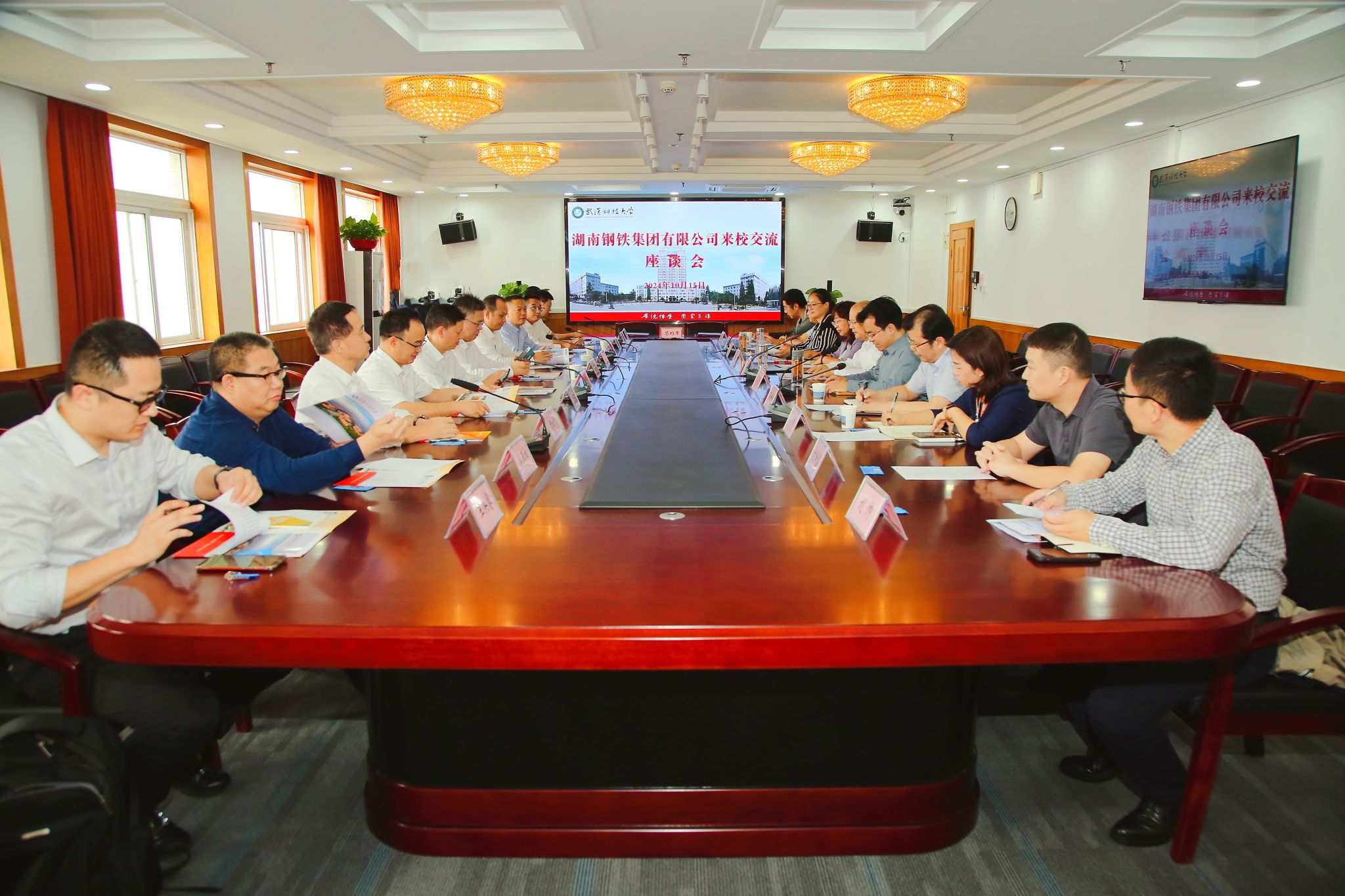 在座谈交流环节,双方共同观看了湖南钢铁宣传片和学校校情宣传片,就进一步深化合作展开了深入探讨。