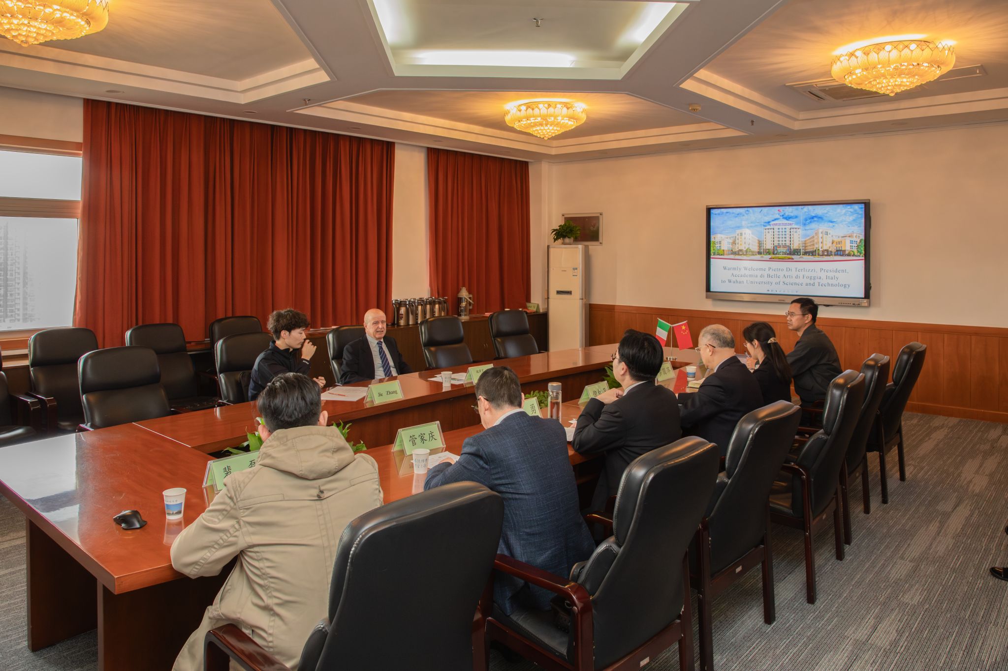 武科大网讯 10月22日,意大利福贾美术学院校长彼得罗·迪·特里奇教授一行来访,商讨与太阳官网合作举办公共艺术专业本科教育项目以及双方在教师互访、学生交流、联合举办师生艺术作品展等方面的合作。校长倪红卫、副校长吕勇出席会议。