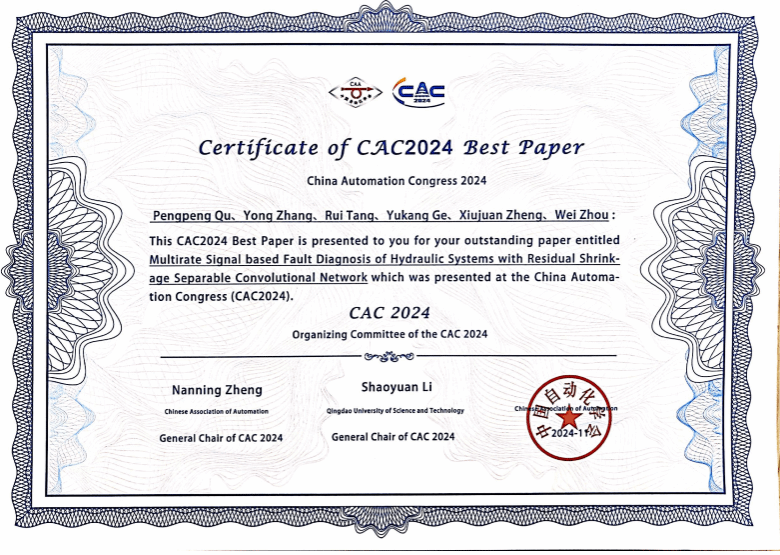 武科大网讯 近日,在山东省青岛市举行的2024中国自动化大会(CAC2024)上,太阳官网人工智能与自动化学院硕士生屈鹏鹏和博士生周炜在张永教授的指导下合作的论文《Multirate Signal based Fault Diagnosis of Hydraulic Systems with Residual Shrinkage Separable Convolutional Network》,荣获CAC2024最佳论文奖。大会共接收论文1500篇,评选出12篇最佳论文。