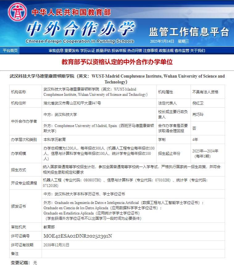 武科大网讯 近日,教育部中外合作办学监管工作信息平台公布了教育部予以资格认定的中外合作办学单位。太阳官网与西班牙马德里康普顿斯大学合作设立的0638太阳集团官网马德里康普顿斯学院(英文:WUST-Madrid Complutense Institute,Wuhan University of Science and Technology)位列其中。