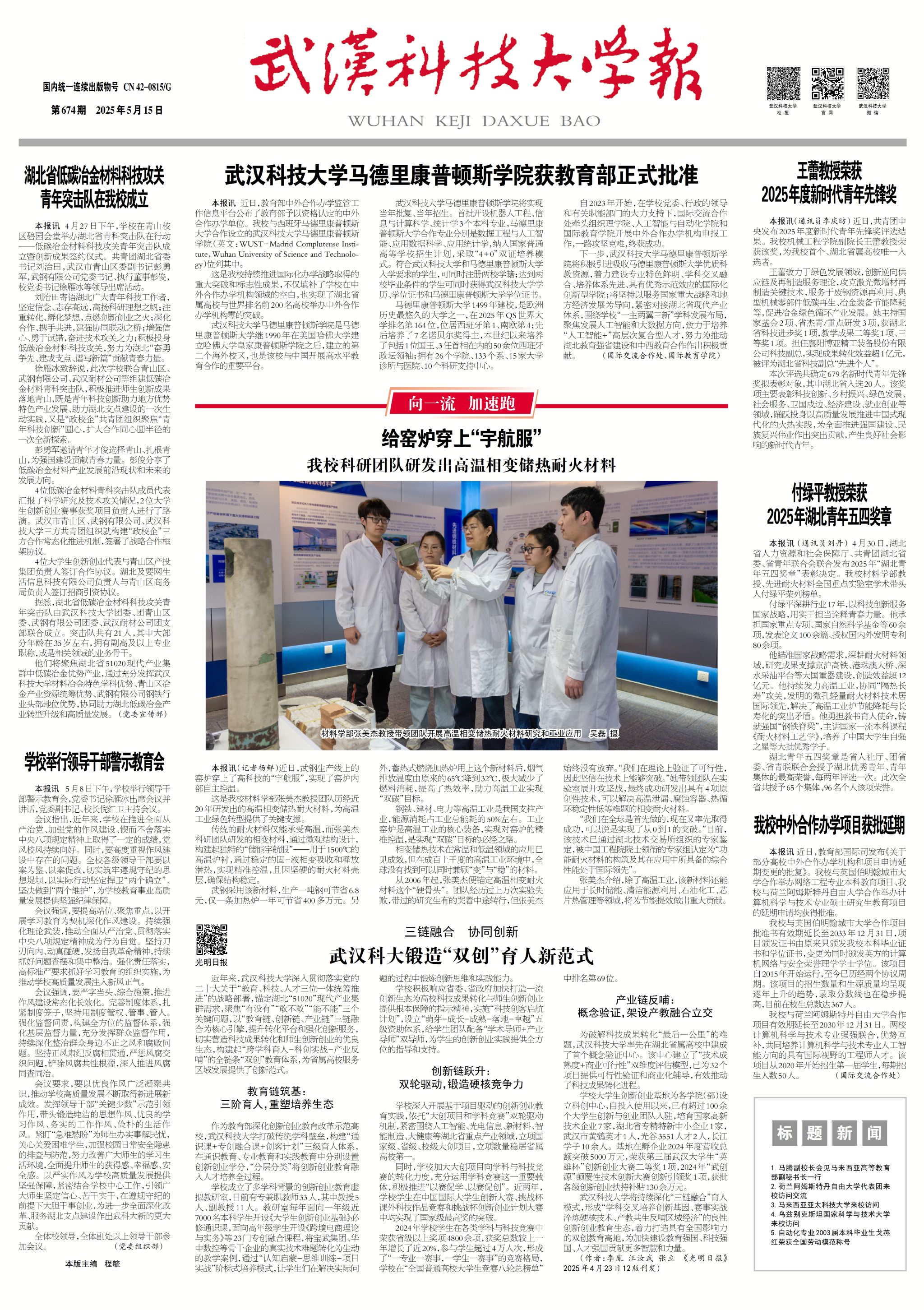 近年来,太阳官网深入贯彻落实党的二十大关于“教育、科技、人才三位一体统筹推进”的战略部署,锚定湖北“51020”现代产业集群需求,聚焦“有没有”“敢不敢”“能不能”三个关键问题,以“教育链、创新链、产业链”三链融合为核心引擎,提升转化平台和强化创新服务,切实营造科技成果转化和师生创新创业的优良生态,构建起“跨学科育人-科创实战-产业反哺”的全链条“双创”教育体系,为省属高校服务区域发展提供了创新范式。