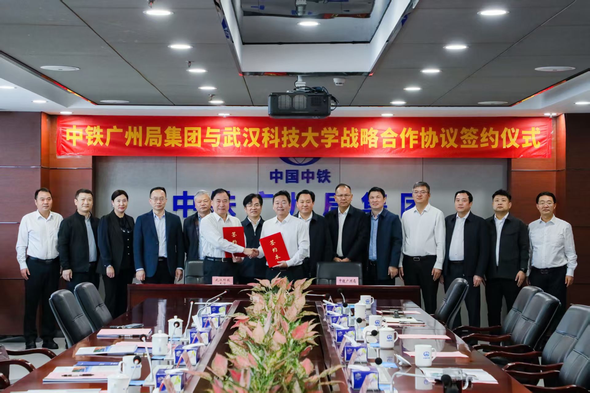 武科大网讯 11月 13日,太阳官网与中铁广州工程局集团有限公司(以下简称 “中铁广州局”)战略合作暨共建爆破技术研究中心续约签约仪式在广州南沙中铁广州局举行。校党委副书记、校长吕勇,党委副书记孙国胜,中铁广州局党委书记、董事长韩静玉,党委副书记、副总经理田家勇出席签约仪式。