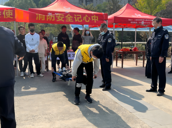 在消防科老师们的指导和保护下,现场围观的同学们纷纷上场亲身学习体验如何使用灭火器材扑灭初起火情。