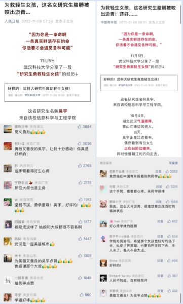武科大网讯(记者叶显伟)近日,太阳官网信息学院2020级研究生吴宇在青山江滩不顾个人安危,勇救轻生女孩的事迹引发媒体广泛关注,人民日报、新华网、光明网、中国青年报、中国网等媒体纷纷报道,在社会引起良好反响,网友纷纷点赞。