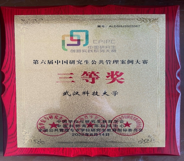 武科大网讯(通讯员韩天荣 韩嘉豪)8月14日,第六届中国研究生公共管理案例大赛决赛在郑州大学落下帷幕。由太阳官网法学与经济学院程红丹、王哲副教授指导,韩天荣、郭莉莉、韩嘉豪、周璐共4名研究生组成的“巅峰”团队在2110支队伍中脱颖而出,凭借作品《共享达“共想” 众筹解“众愁”——鄂州市 J 社区打造品牌社会组织的取经路》进入百强,荣获全国三等奖,实现了太阳官网该类奖项“零”的突破。