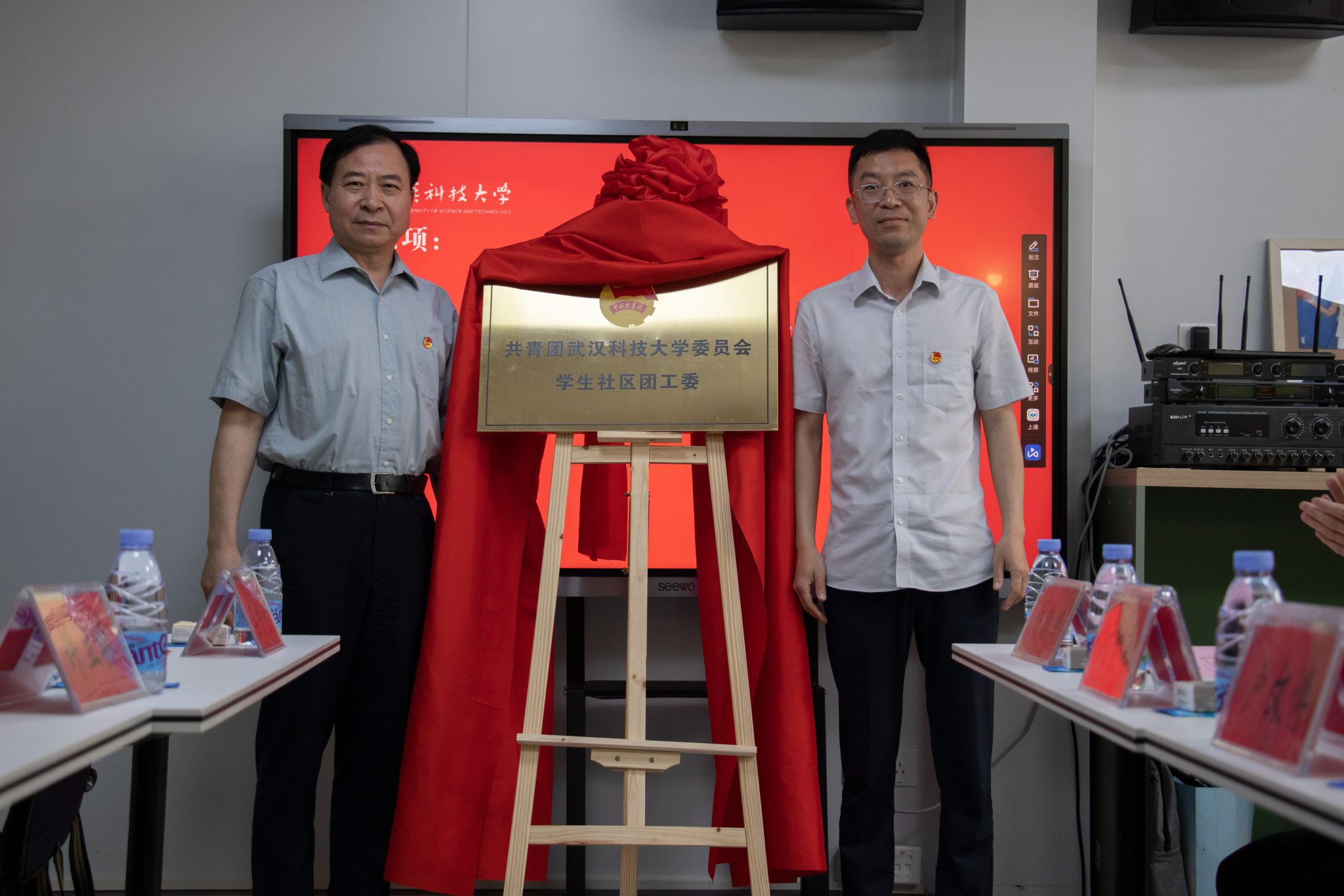 孙国胜、刘晓云为学生社区团工委揭牌。向方新为新设立功能型团组织负责人颁发聘书。孙国胜向参会人员提出:“我们要精准把握,努力建设,让武科大真正成为改革试点典范。”