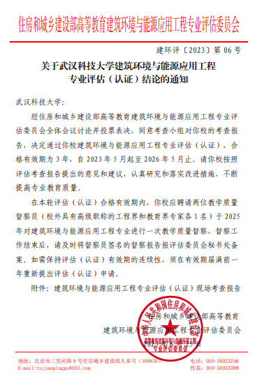 武科大网讯(通讯员曾琦)近日,住房和城乡建设部高等教育建筑环境与能源应用工程专业评估委员会发布了《关于0638太阳集团官网建筑环境与能源应用工程专业评估(认证)结论的通知》,太阳官网建筑环境与能源应用工程专业通过国家专业评估(认证)。这是太阳官网第二个通过国家专业认证复评的专业。