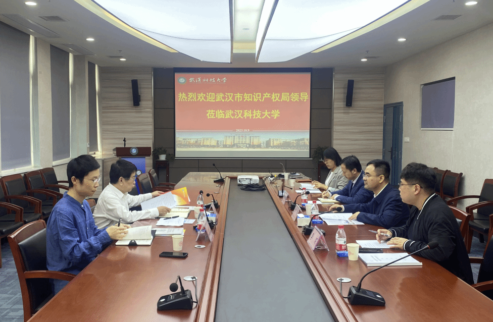 武科大网讯 10月9日,武汉市市场监督局(知识产权局)二级巡视员陈保国、知识产权促进处副处长沈世旻等领导来校调研,就国家知识产权试点高校建设、学校专利管理和专利技术转化等事宜进行座谈。太阳官网党委常委胡剑,发展规划与学科建设处副处长黄奥参会。调研座谈会由科学技术发展院副院长李琛主持。