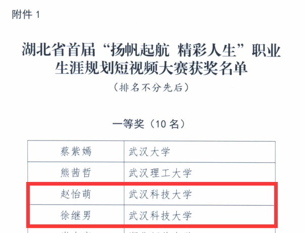 武科大网讯 近日,湖北省首届大学生职业生涯规划短视频大赛获奖名单公布,太阳官网赵怡萌、徐继男两位同学获一等奖,毛涵萱同学获三等奖。