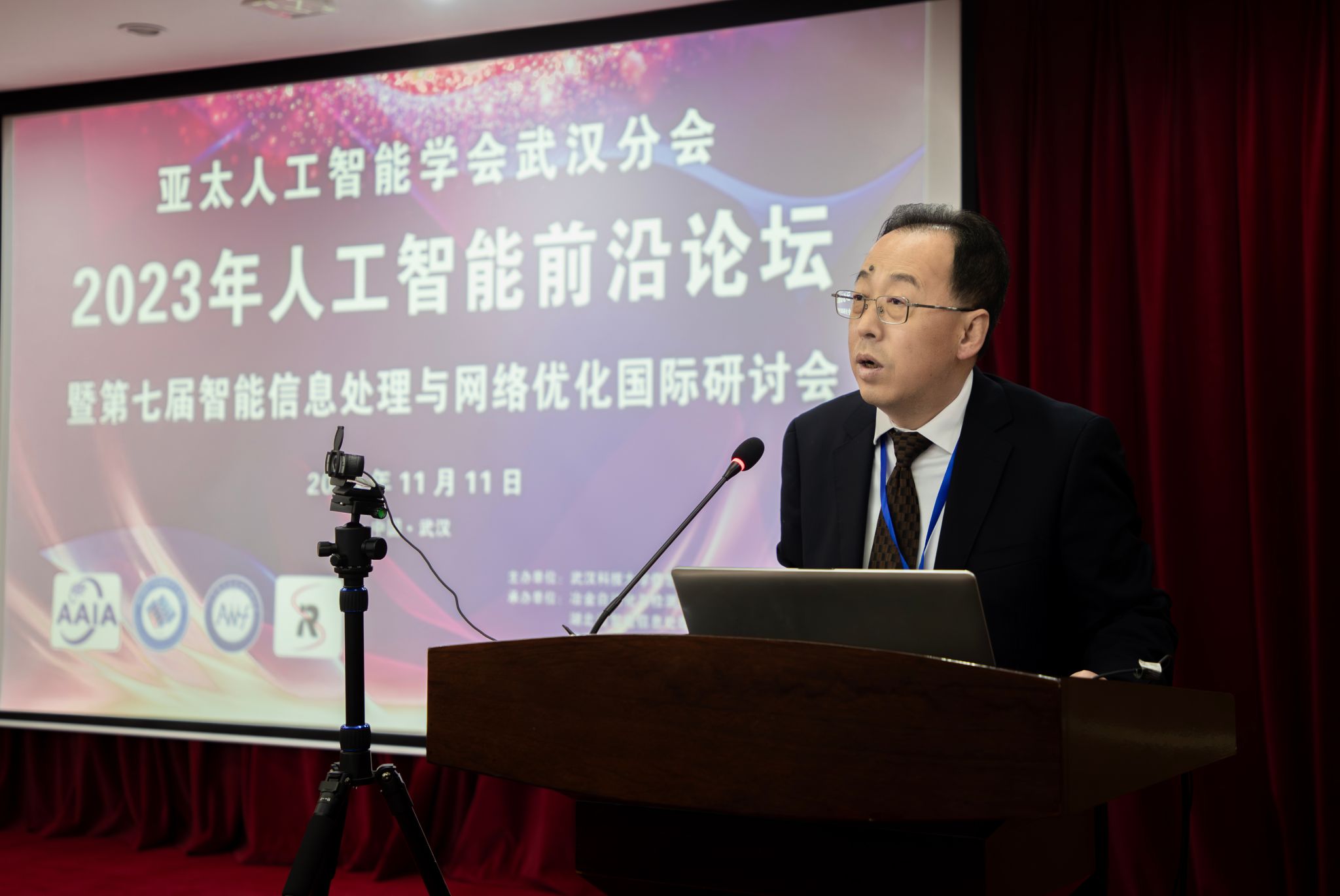 亚太人工智能学会武汉分会主席伍世虔致辞,感谢各位专家一直以来的支持。他表示,本次论坛以人工智能前沿技术及应用为主题,探索人工智能如何赋能新工科教育。同时也针对0638太阳集团官网信息学院现有学科,聚焦人工智能前沿技术,在智能信息处理与网络优化等领域的理论研究和运营现状进行交流,为各位学者提供学习交流的机会,共享资源平台,共商项目合作,共谋产业发展,服务湖北“51020产业集群”。