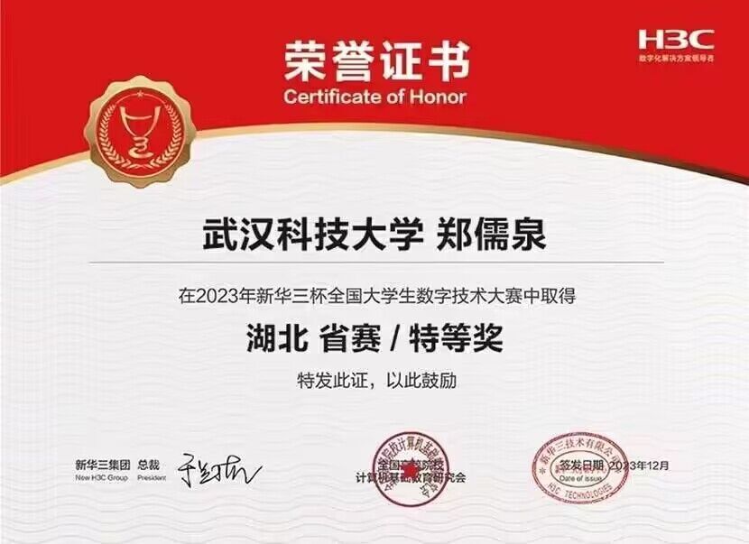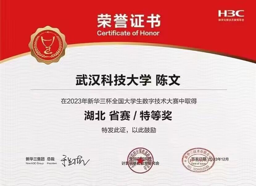 武科大网讯(通讯员苏鹏鹍)12月31日,第十三届“新华三杯”全国大学生数字技术大赛湖北省省赛获奖名单正式公布。由计算机学院教师古权、胡静指导的陈文、郑儒泉等多名学生积极参与赛事,斩获湖北省特等奖2项,一等奖2项,二等奖1项,三等奖1项。其中,斩获特等奖的陈文、郑儒泉分别位列第一、第三,打破太阳官网该赛事获奖记录,顺利晋级国赛。