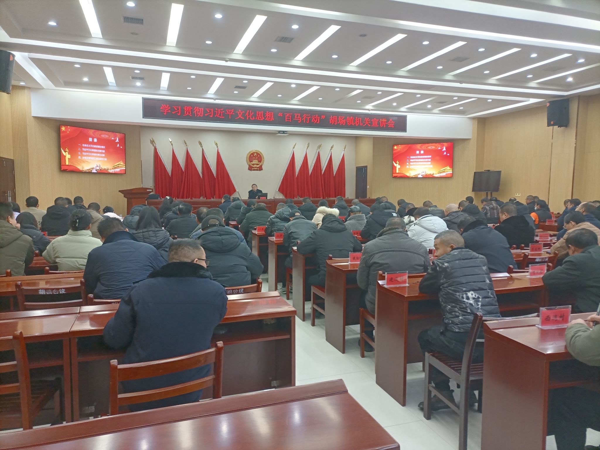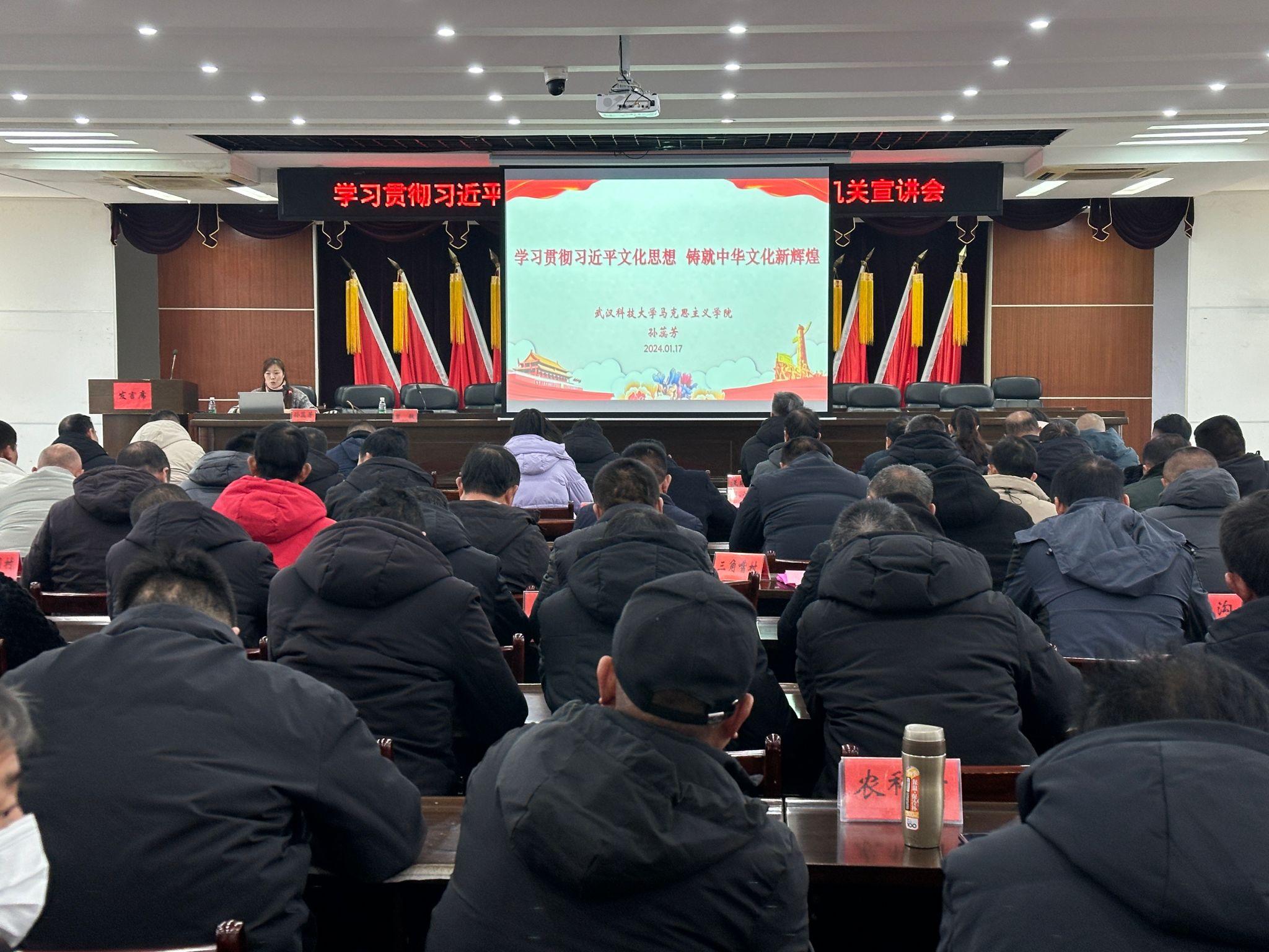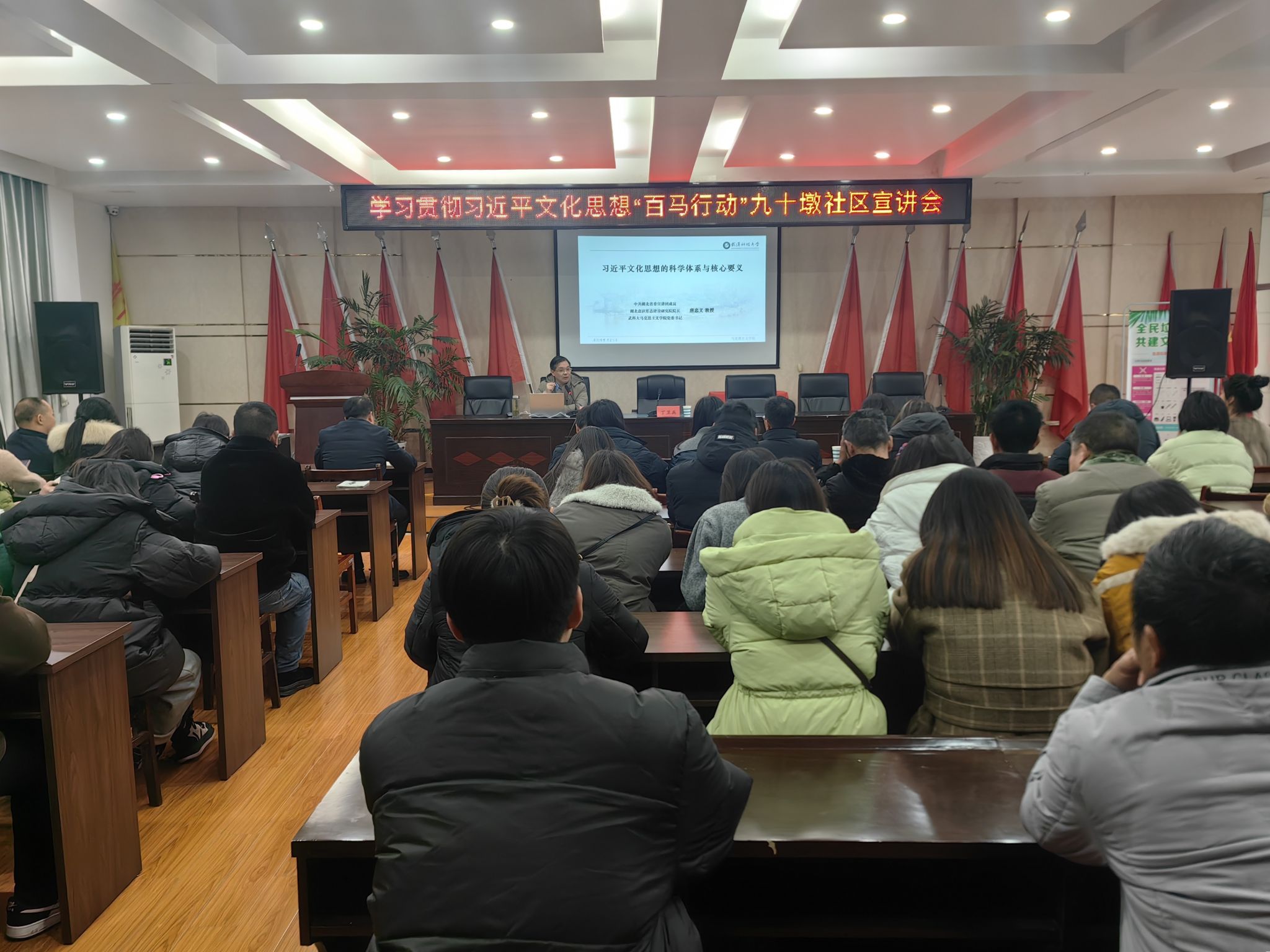 在胡场镇,张齐武教授以《建设物质文明和精神文明全面发展的社会主义—深入学习贯彻习近平文化思想》为主题进行了宣讲,全镇机关和下辖村湾干部、党员约150人参加活动。宣讲从社会主义文化建设理论常识、习近平文化思想的主要内容、习近平文化思想的重大创新、协调发展物质文明和精神文明四个方面展开,深入展现和阐释了习近平文化思想的博大精深和核心要义。在实践要求方面,结合中央经济工作会议精神,从科学认识经济基础与上层建筑的关系、物质财富与精神财富的关系、物质文明与精神文明的关系出发,指出必须以习近平文化思想为指导,统筹抓好物质文明和精神文明建设,推动形成适应新时代要求的思想观念、精神面貌、文明风尚、行为规范,确保中国特色社会主义伟大事业行稳致远。