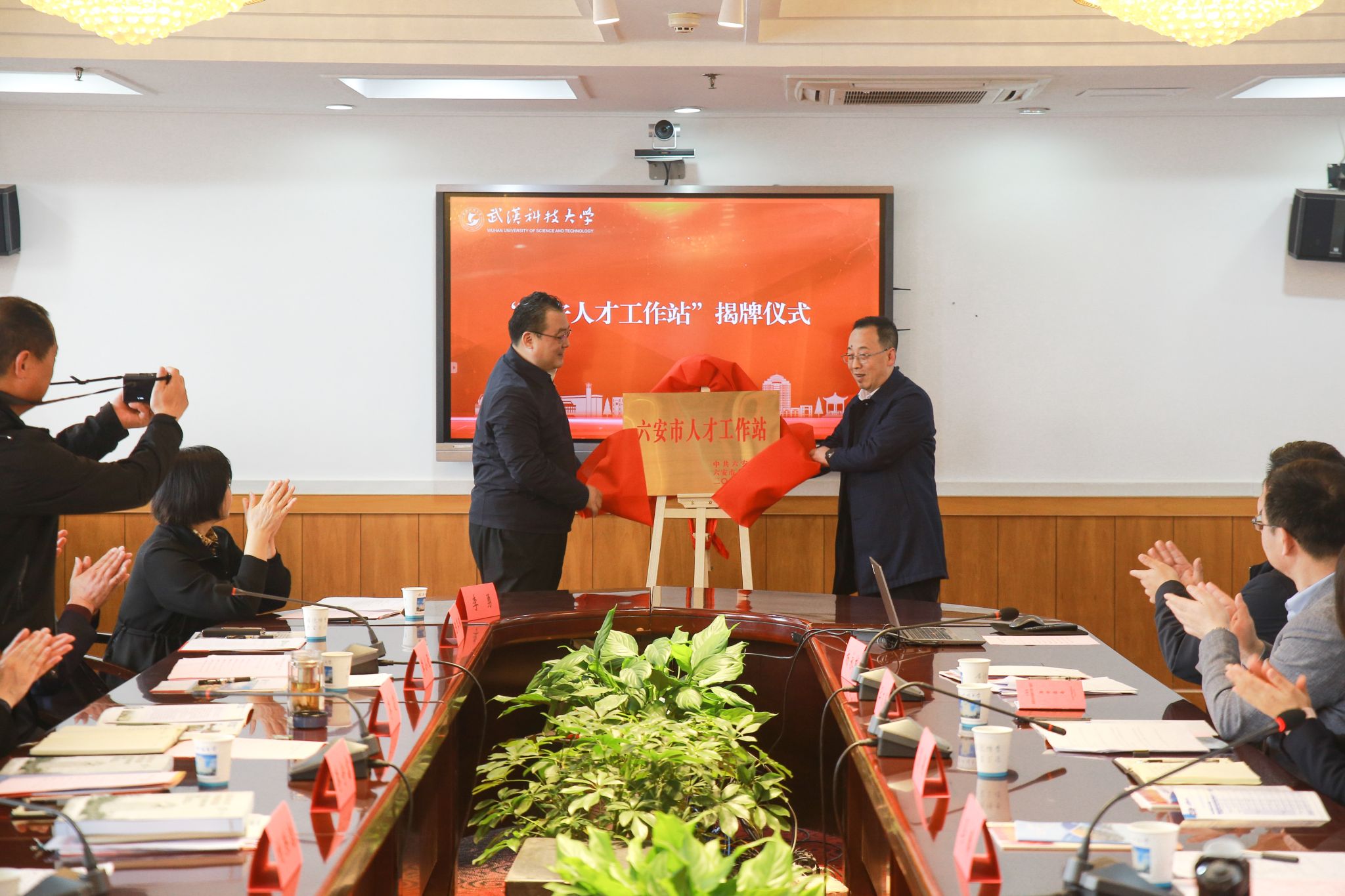 刘洪洁与马腾为“六安人才工作站”揭牌。