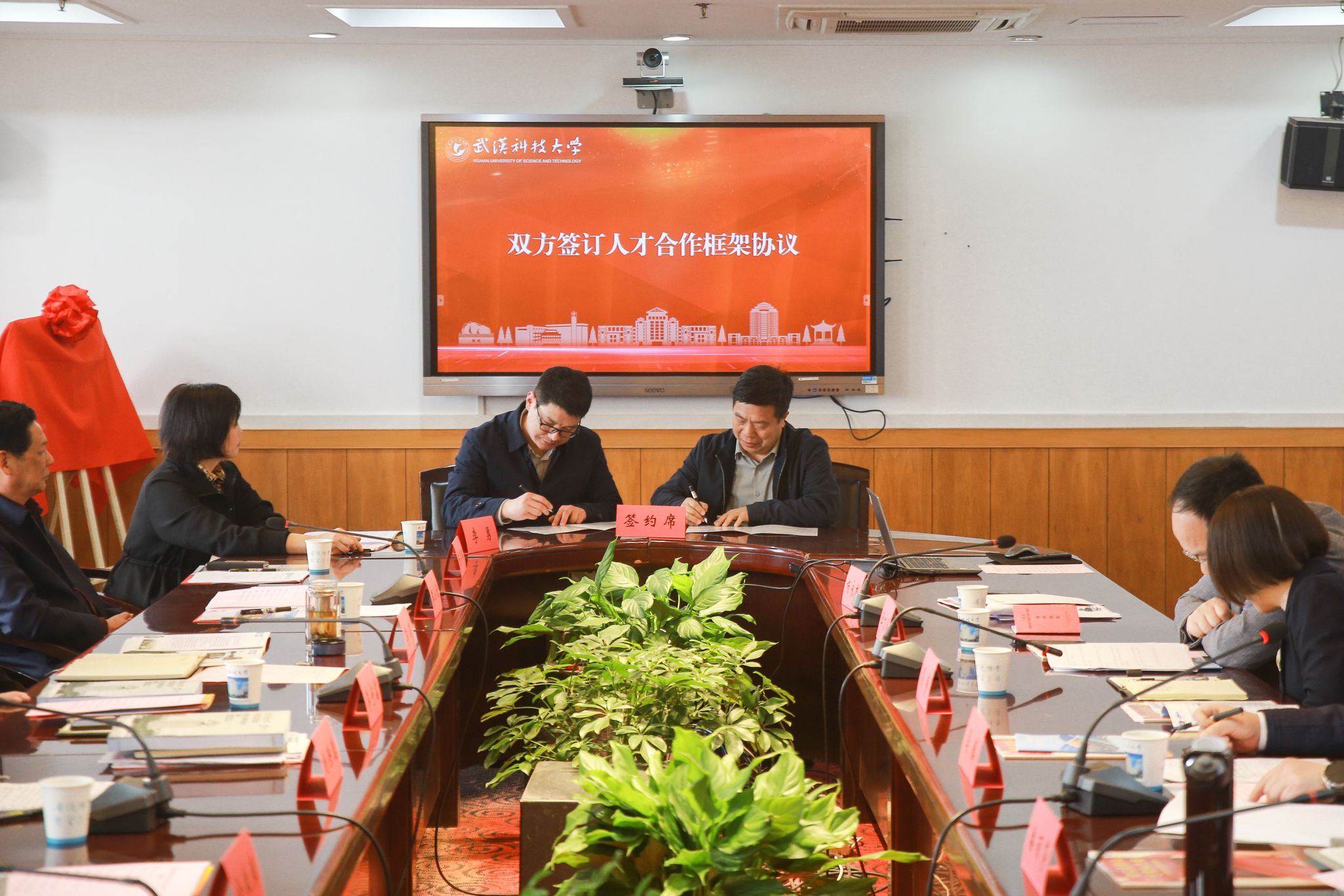 杨永彬与六安市人社局党组成员副局长李小天签订人才资源合作协议。