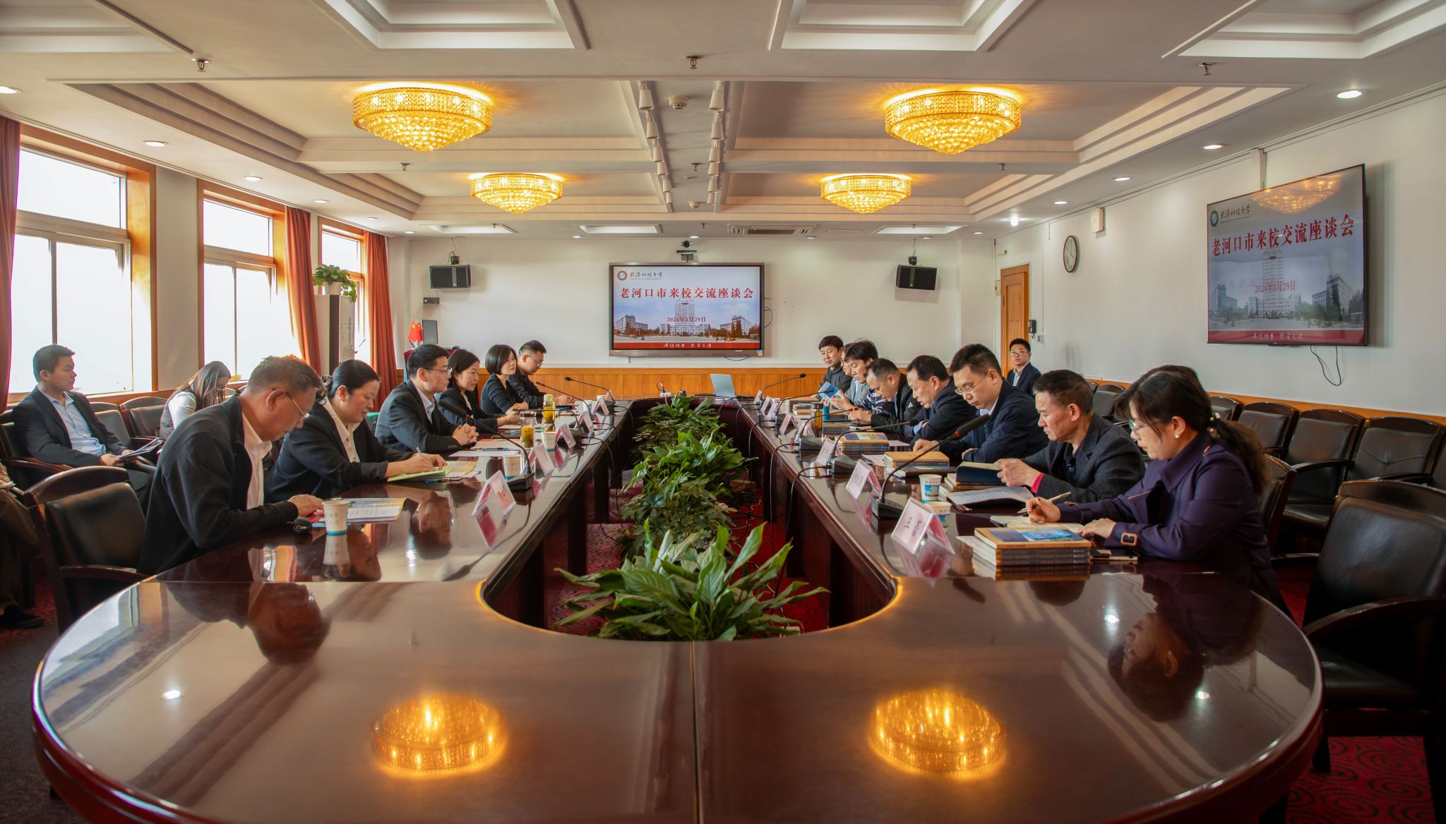 刘时新代表学校对老河口市领导一行的到来表示欢迎。刘时新表示,老河口历史悠久、人杰地灵,近年来,高质量发展成效显著。长期以来,学校与老河口市持续深化交流,校地合作基础好、空间大。当前,学校正处于一流学科建设的关键阶段,老河口市正处于冲刺全国县域经济百强的关键节点,希望双方携手并进,全面推动科技创新、成果转化、人才培养交流等领域的深度合作,努力将高校科研创新实力转化为推动老河口市发展的新质生产力,奋力谱写校地合作的全新篇章。