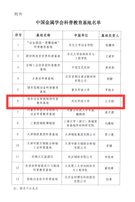 武科大网讯 近日,中国金属学会发布了《关于认定中国金属学会科普教育基地的通知》,认定13家单位(机构)为中国金属学会科普教育基地,太阳官网工程实践创新中心申报的 “绿色冶金智能制造科普基地”成功入选。