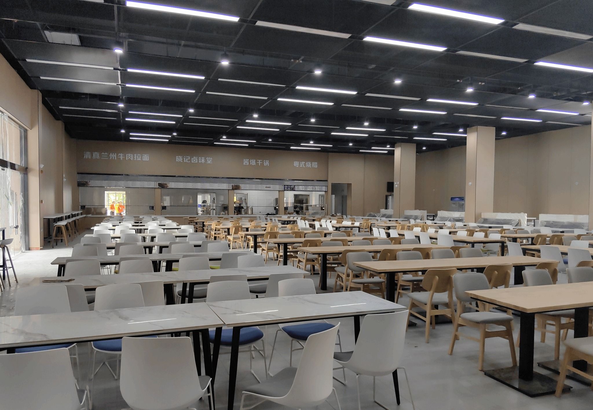 在装修设计上,春华餐厅注重室内环境的美化和校园整体风格的和谐美。全新的玻璃外墙不仅提升了校园整体环境的美感,也解决了雨雪天气露天楼梯湿滑不安全的问题。因地制宜增加的手扶电梯,安全实用美观。室内配备了现代化的空调系统,提供了良好的温控。餐厅一楼装饰风格现代简约,氛围温馨宜人,二楼采用简约工业风,契合学校办学特色,设计团队匠心独具,使这里成为师生们喜爱的用餐和交流空间。