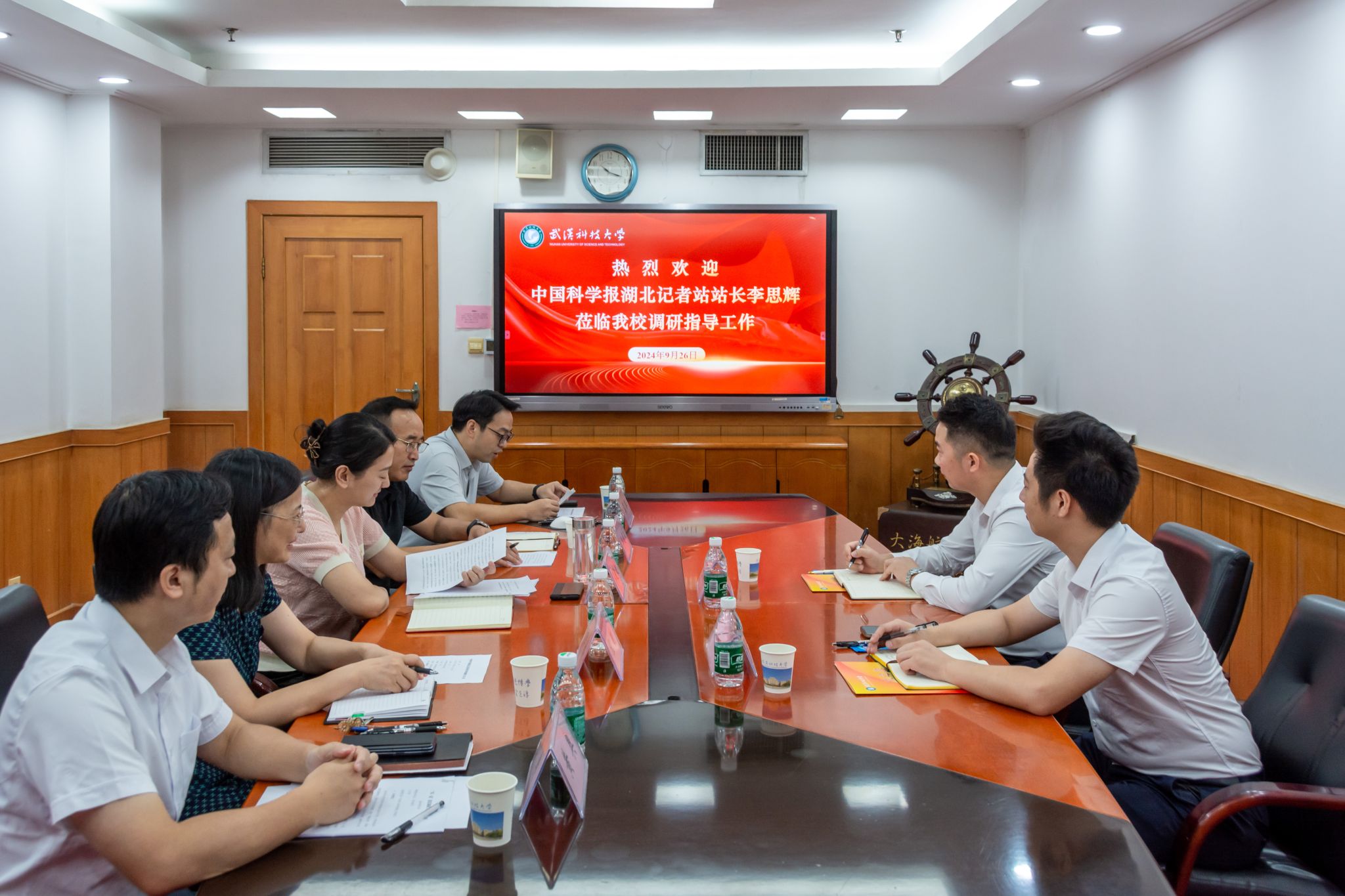 武科大网讯 9月26日上午,中国科学报湖北记者站站长李思辉一行来校开展调研和座谈交流。学校党委副书记孙国胜会见来宾,党委宣传部、发展规划与学科建设处、科学技术发展院等部门负责人参加调研座谈。