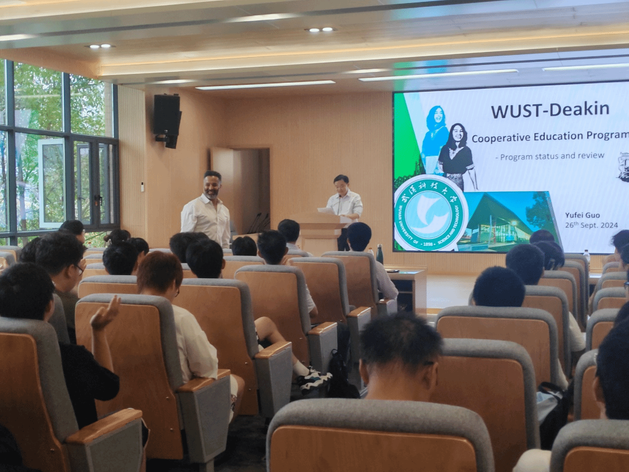 迪肯大学工程学院王亚楠副院长向机械工程国际班2023级学生介绍迪肯大学的基本情况及国际学生支持服务,宣讲了迪肯大学对于转学、攻读研究生学位的最新政策,鼓励大家刻苦钻研,谱写人生新的篇章。(机械学院)