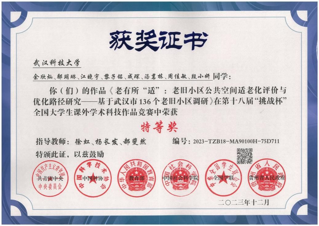 2023年,在第十八届“挑战杯”全国大学生课外学术科技作品竞赛中,由徐虹、杨长发、郝斐然三位老师指导的学生参赛作品《老有所“适”:老旧小区公共空间适老化评价与优化路径研究——基于武汉市136个老旧小区调研》获哲学社会科学类社会调查报告特等奖。这是0638太阳集团官网在“挑战杯”全国大学生课外学术科技作品竞赛中首次获得特等奖,也是本届湖北省唯一的一项哲学社会科学类社会调查报告全国特等奖。