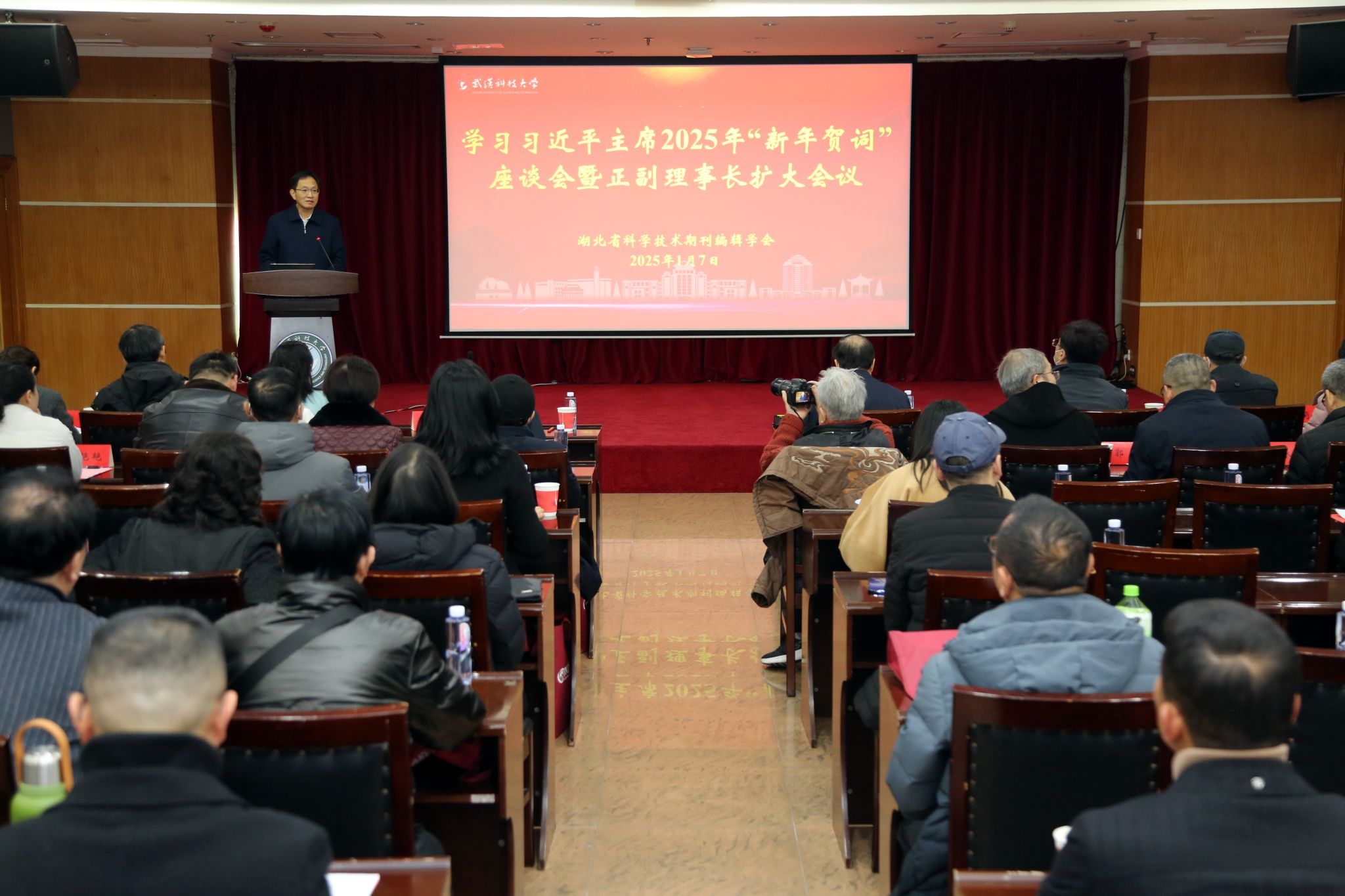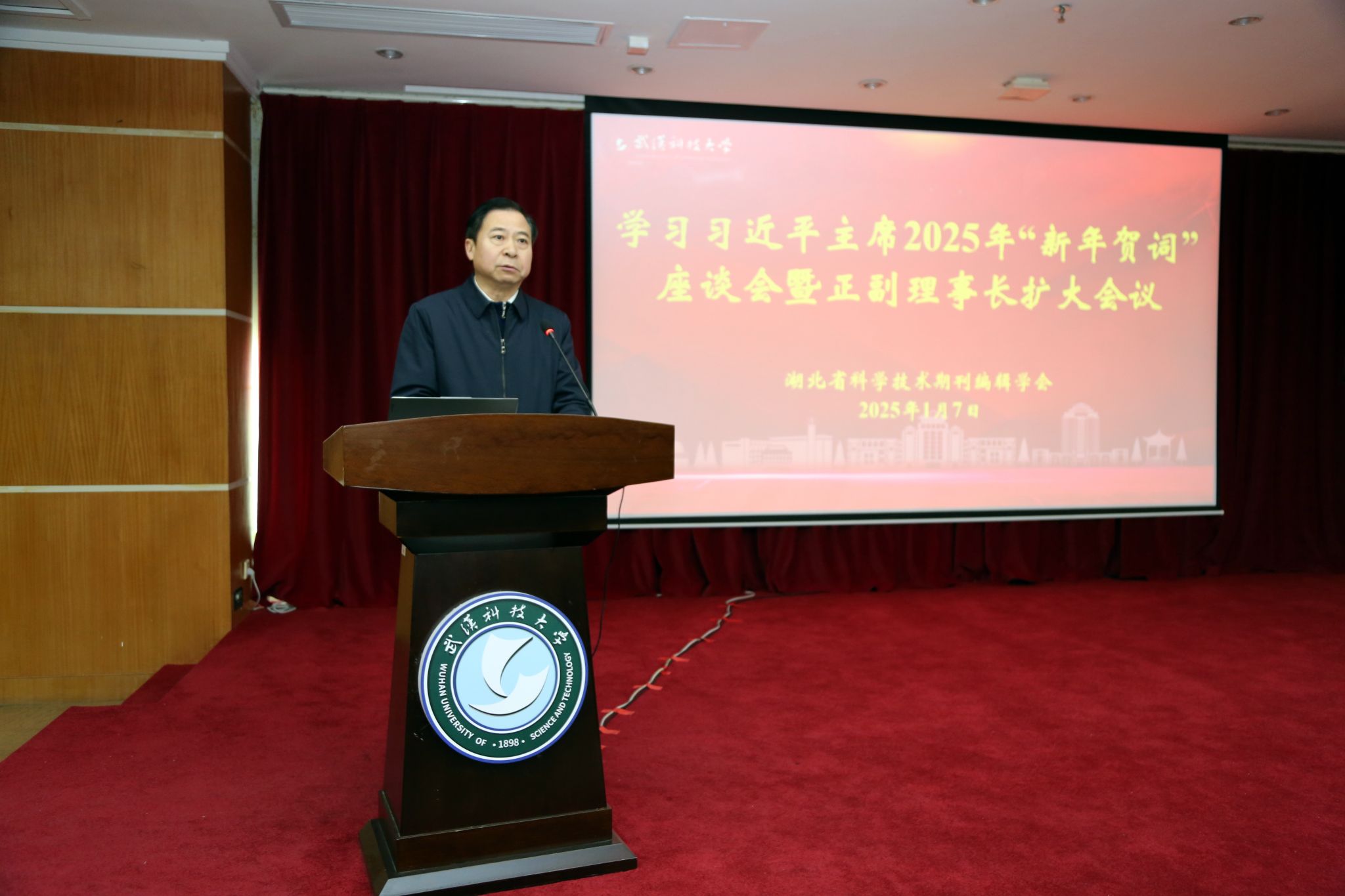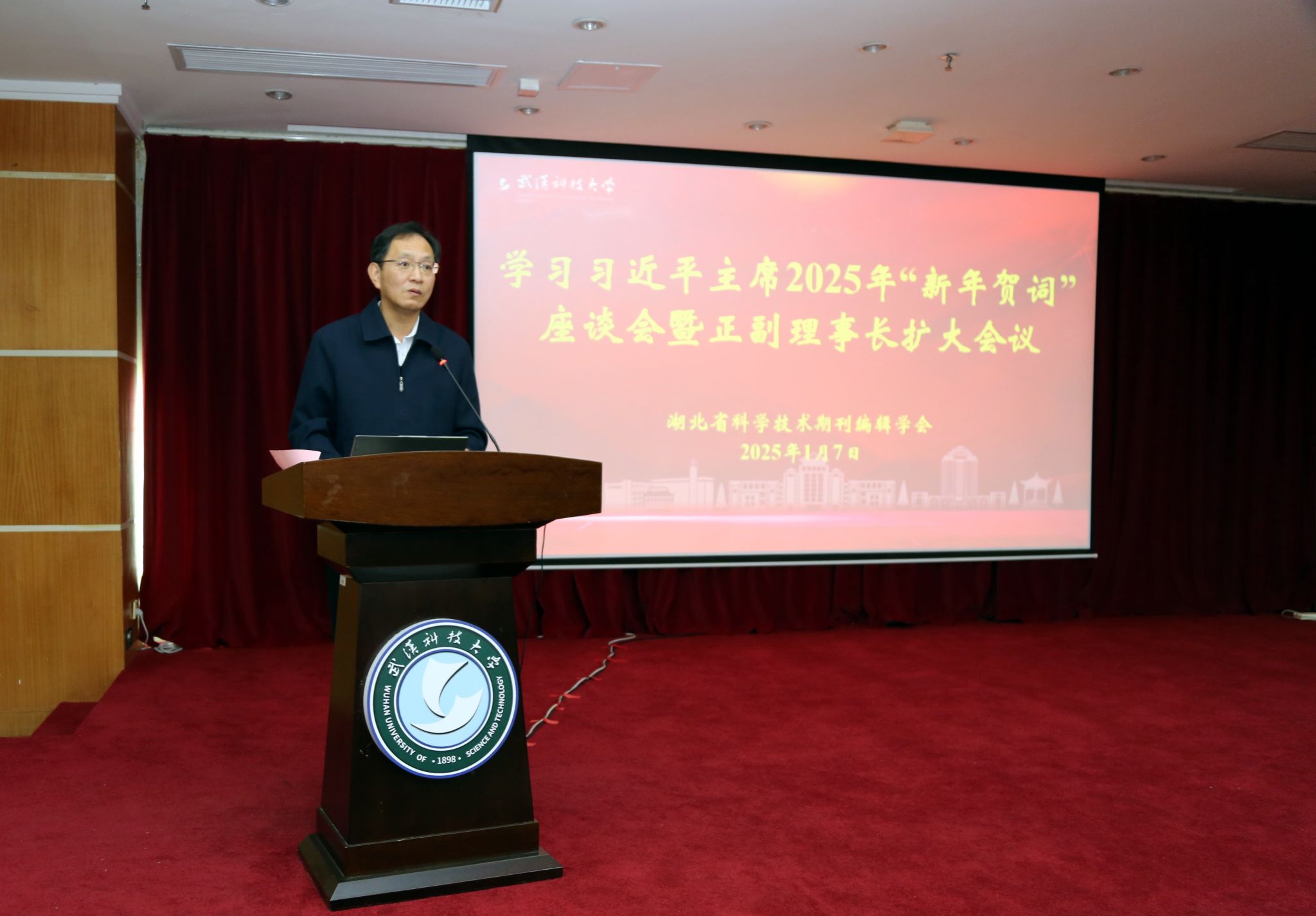 武科大网讯 1月7日,学习习近平主席 2025 年 “新年贺词” 座谈会暨湖北省科技期刊编辑学会正副理事长扩大会议于太阳官网青山校区主楼18楼报告厅举行。校党委副书记孙国胜出席会议并致辞。会议由湖北省科技期刊编辑学会理事长赵经主持,近百位相关领域专家学者齐聚一堂。