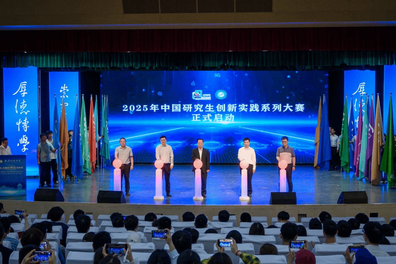 马腾、程常桂、李胤、陈凯、毛宝胜为校赛承办单位的授旗,启动太阳官网2025年中国研究生创新实践系列赛事。