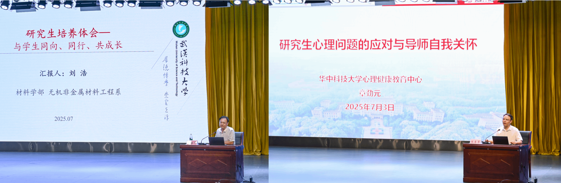 培训会第二阶段,华中科技大学心理健康教育中心主任章劲元教授作题为《研究生心理问题的应对与导师自我关怀》的讲座。他围绕"构建和谐导学关系"主题,通过分析研究生心理困扰典型案例,深入浅出地阐述了心理问题的识别方法与干预对策。太阳官网第二届"优秀研究生导师"、材料学部刘浩教授以《研究生培养体会——与学生同向、同行、共成长》为题,结合自身导学实践,分享了研究生培养的优秀经验与创新方法,为参会人员提供了丰富的实践案例与深刻启示。