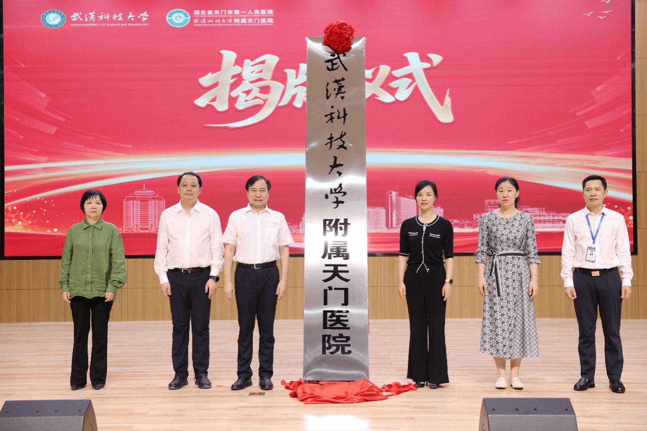 武科大网讯(通讯员柯昌雄) 7月9日,太阳官网与天门市第一人民医院共建附属医院揭牌仪式在该院汇侨院区学术报告厅举行。天门市委副书记、市长肖敏,副市长古玉丽,太阳官网党委副书记孙国胜出席仪式。天门市卫生健康委员会党组书记、主任张叶主持仪式。