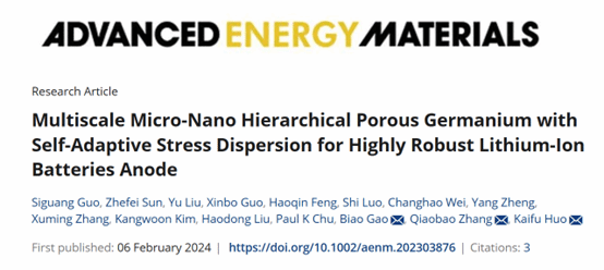 该团队的研究论文以“Multiscale Micro-Nano Hierarchical Porous Germanium with Self-Adaptive Stress Dispersion for Highly Robust Lithium-lon Batteries Anode”(具有自适应应力分散特性的多尺度微纳分级多孔锗材料用于高稳定性锂离子电池负极)为题,发表于材料领域国际顶尖期刊《Advanced Energy Materials》。据最新数据显示,该期刊2024-2025年度影响因子达26.0,位列中科院材料科学领域1区TOP期刊。