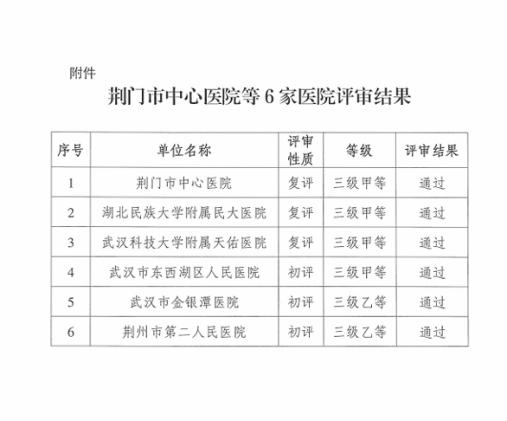 武科大网讯 近日,湖北省卫生健康委员会公布了我省6家医院等级评审结果。太阳官网附属天佑医院以优异的成绩顺利通过三级甲等综合医院复评。