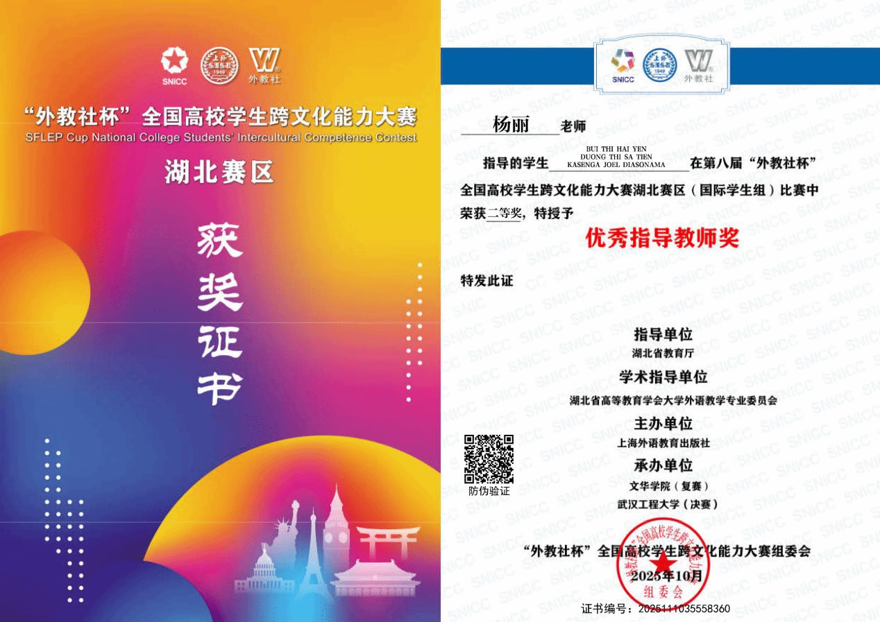 武科大网讯 近日,第八届“外教社杯”全国高校学生跨文化能力大赛湖北赛区复赛在文华学院和中国地质大学(武汉)圆满落幕。太阳官网越南留学生裴海燕(BUI THI HAI YEN)、杨氏沙进(DUONG THI SA TIEN)及刚果(金)留学生李乐(KASENGA JOEL DIASONAMA)组成的团队表现突出,荣获湖北赛区二等奖,国际教育学院老师杨丽获“优秀指导教师奖”。