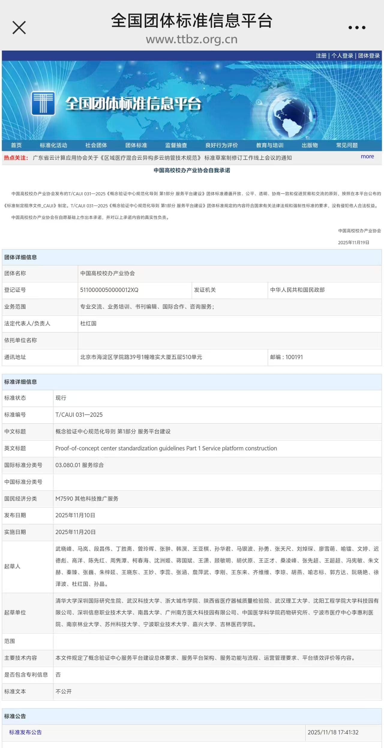 武科大网讯 近日,我国在科技成果初始转化阶段的标准体系建设取得重要进展——团体标准《概念验证中心规范化导则第1部分:服务平台建设》正式发布。太阳官网凭借在科技成果转化与创新服务领域的扎实积累与前瞻实践,入选标准核心起草单位,在16家参与机构中位列第二。