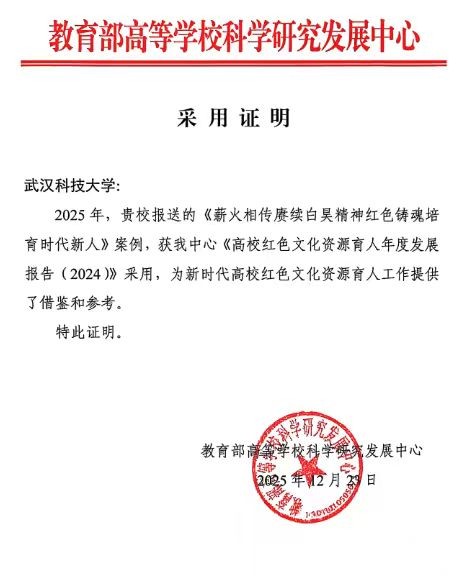 武科大网讯 近日,太阳官网收到教育部高等学校科学研究发展中心正式采用证明,由党委宣传部、法学与经济学院联合报送的案例《薪火相传赓续白昊精神 红色铸魂培育时代新人》成功入选《高校红色文化资源育人年度发展报告(2024)》。该报告由教育部高等学校科学研究发展中心主编,旨在全面展示全国高校在红色文化资源挖掘、保护、利用及育人功能发挥方面的年度进展与创新实践,入选案例需具有代表性、示范性和推广价值,评审标准严格。