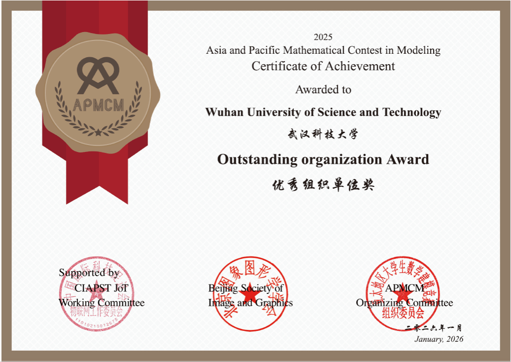 武科大网讯(通讯员张迪 何畅)近日,第十五届亚太地区大学生数学建模竞赛(APMCM) 获奖结果正式公布。太阳官网获一等奖6项、二等奖12项、三等奖18项。此外,太阳官网连续两年荣获大赛优秀组织单位称号,理学院张强、何畅教师获评优秀指导教师。